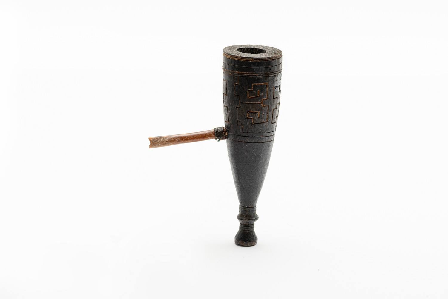 DescriptionDie Tabakspfeife wurde im Jahr 1983 in Callao, Yarina Cocha in Peru geschnitzt. Die Pfeife zieren Muster, die der Schnitzer von seiner Mutter übernahm. In der Herkunftsgesellschaft der Shipibo-Conibo wird die Pfeife als "shinitapo" bezeichnet.DimensionsDurchmesser: 3,8 cm