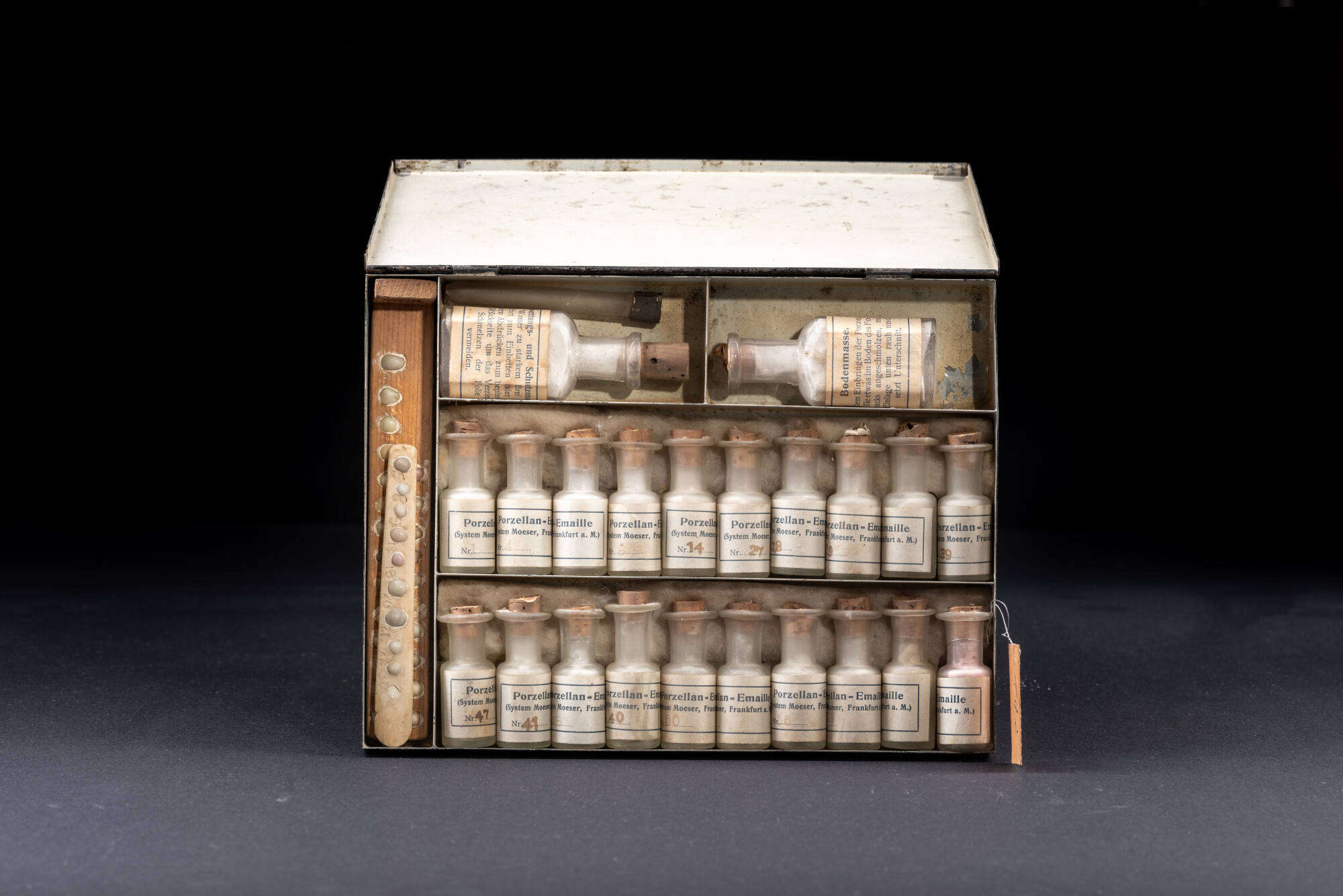 DescriptionDie „Neuerfindung“ von Porzellan in Deutschland um 1709 markiert einen wichtigen Schritt in der Geschichte des Zahnersatzes. Durch Porzellanzähne und -gebisse konnten Funktion und Ästhetik erstmalig zufriedenstellend miteinander verbunden werden. Das hier abgebildete Porzellansortiment bot die Möglichkeit verschiedener Farbabstufungen für sogenannte Jacketkronen und Facetten. Diese ersetzen einen beschädigten Zahn nicht vollständig, sondern ummanteln ihn lediglich. Die Zahnpaletten im Vordergrund bilden einen „Zahnfarbschlüssel“, der es ermöglichen sollte, der natürlichen Zahnfarbe des Patienten möglichst nahe zu kommen. Die kleinen Döschen dahinter beinhalten die dafür benötigten Pulver. Marktführend war hierbei auch die amerikanische Firma Justi & Son, die auch dieses Sortiment produzierte. Trotz negativer Aspekte wie leichter Zerbrechlichkeit, einem Klappern beim Sprechen und ungenauen Passformen konnte sich Porzellan gegenüber anderen Stoffen viele Jahre behaupten.DimensionsH x B x T: 5,2 × 24,4 × 22 cm