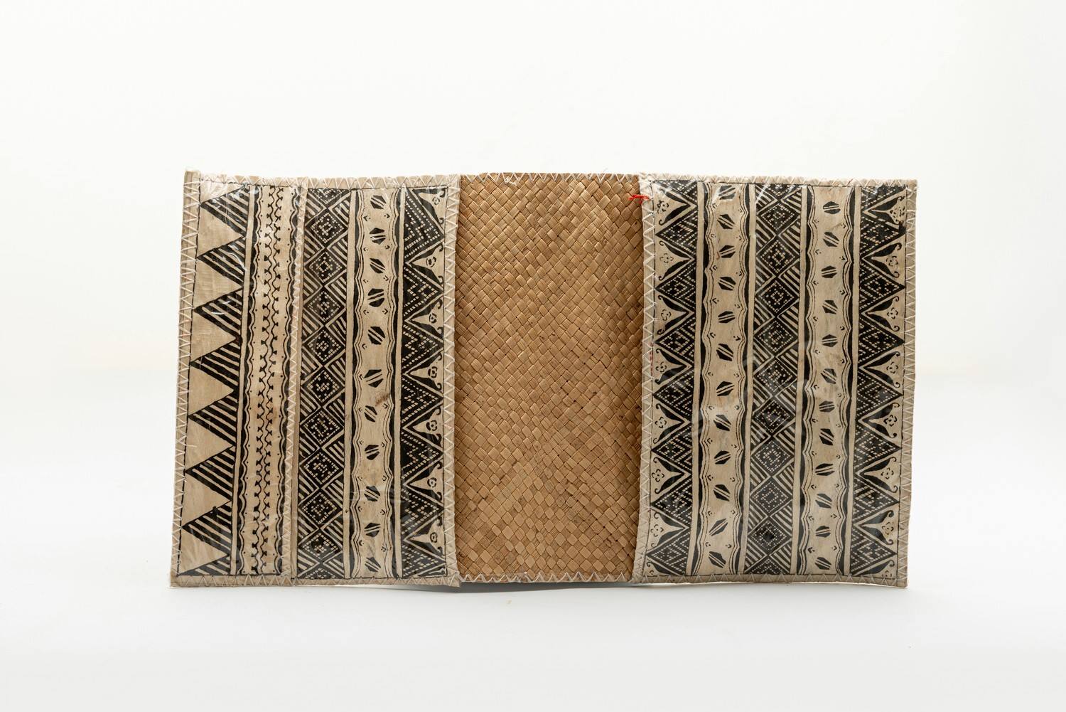 DescriptionDie Briefmappe besteht aus drei Lagen verschiedenen Materials, die fest miteinander vernäht wurden. Die erste innere Lage ist ein in Diagonal-Flechttechnik aus ca. 0,5 cm breiten Pandanusblattstreifen hergestelltes Mattenstück. Die zweite Schicht besteht aus Rindenbaststoff, der in der üblichen dekorativen Manier mit aus Ruß hergestellter schwarzer Farbe ornamental bemalt wurde. Die dritte äußere Schicht bildet die importierte dünne, aber steife Klarsichtfolie. Sie wurde um die Kanten herum gefaltet, und dann wurden die verschiedenen Schichten und Einzelteile der Mappe ebenfalls importierten Kunststoff-Faserstreifen mit einem Dreiecksstich zusammengenäht.DimensionsL x B: 55 × 30 cm