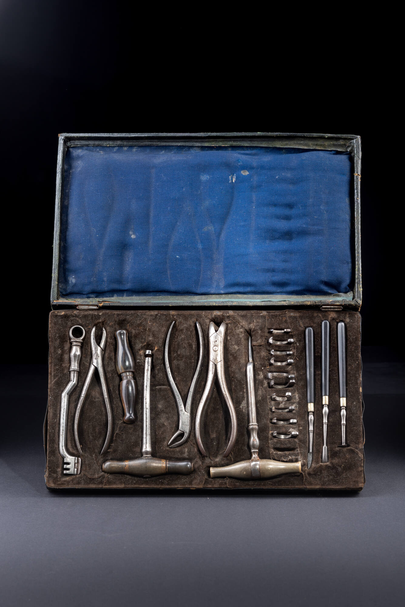 DescriptionDieser nahezu vollständige Instrumentenkasten für die Extraktion von Zähnen enthält neben Zangen und Zahnschlüsseln auch Schneideinstrumente. Die beiden linken Zangen sind Extraktionszangen für die oberen und unteren Molaren nach John Tomes (1815–1895). Der englische Zahnarzt konstruierte diese Zangen nach anatomischen Kriterien. Die Zange rechts ist eine für Weisheitszähne. Am rechten Rand heißen die Instrumente: Skalpell, Raspatorium und Meißel. Die Art der Instrumente macht eine Datierung in die zweite Hälfte des 19. Jahrhunderts wahrscheinlich. Beim Exponat wurde die Beschriftung Instrumentenkiste des „Dr. Grausam“ gefunden. Laut der Information des Tübinger Zahnarztes Paul Mühlhäusler soll diese Kiste dem Bader Schelling aus Rottweil oder aus der Nachbarstadt Schramberg gehört haben. Neben den ortsansässigen Badern gab es Barbiere, die Patienten über Land versorgten. Herumreisende Zahnärzte praktizierten noch bis in die erste Hälfte des 20. Jahrhunderts.DimensionsH x B x T (Kiste): 6,5 × 31,5 × 18,5 cm