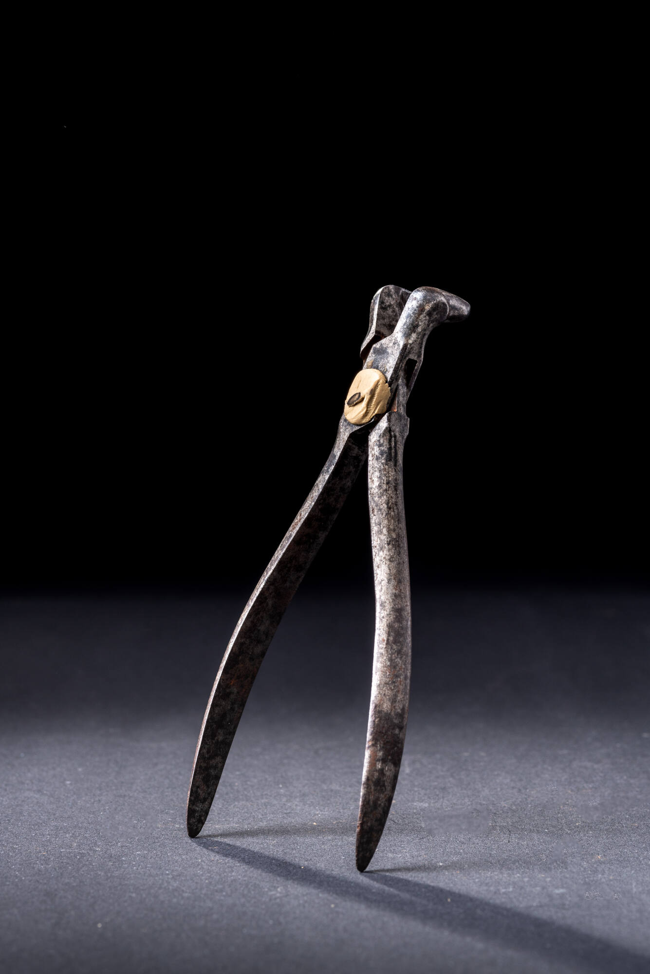 DescriptionAuch diese Zange mit einem speziellen Kopf dient der Zahnextraktion. Bereits seit der Antike existierten Zahnzangen. Das heißt, dass lange vor dem Auftreten der modernen Anästhesie im 18. Jahrhundert mit diesen Werkzeugen Zahnbehandlungen durchgeführt wurden. Für die Extraktion unterschiedlich geformter Zähne erfuhr die Zahnzange im Laufe der Geschichte viele Veränderungen, so dass heute unterschiedlich geformte Varianten zur Anwendung kommen. Diese Extraktionszangen besitzen nicht selten ein sehr ästhetisches Aussehen und ähneln häufig dem Schnabel eines Vogels oder dem Kiefer eines Hundes. Durch diese besondere Gestaltung der Kopfseite wird der zu extrahierende Zahn deutlich fester gehalten. Das hier gezeigte Exemplar weist dagegen eine sehr schlichte Form auf, bei der die Handhabung im Vordergrund stand.DimensionsL x B x H: 14,4 × 2,6 × 2,2 cm