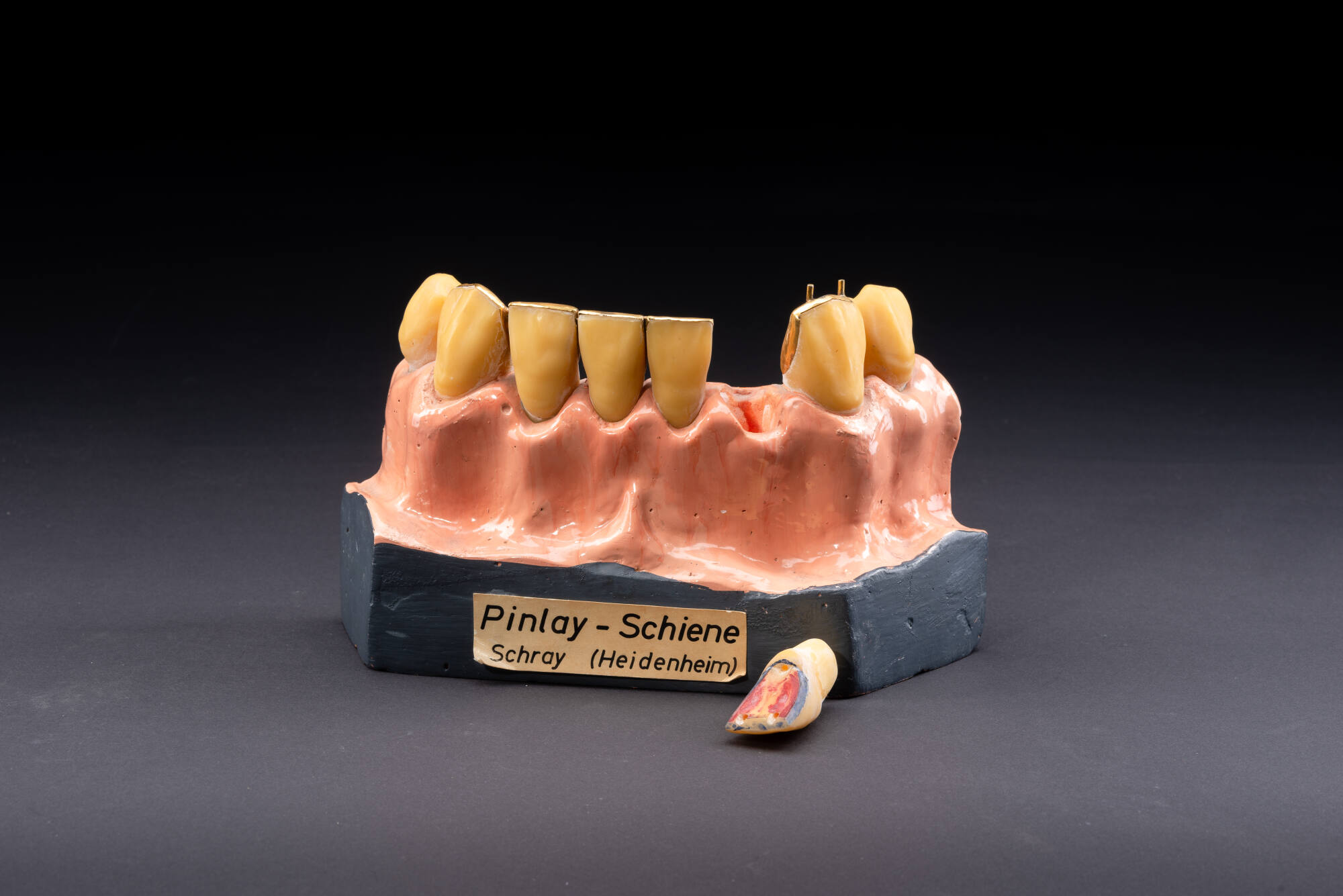 DescriptionDas Pinlay-Verfahren findet im Bereich der zahnärztlichen Implantologie Anwendung. Dabei wird das Implantat mittels eines Iridium-Platin-Stifts (Pin) direkt am betroffenen Zahn befestigt. Hierfür wird zuerst ein Loch gebohrt. Der dadurch abgeriebene Zahnschmelz wird dem Kunstzement zugefügt, um einen besseren Halt des Onlays zu gewährleisten. Er bildet die Basis für die anzubringende Goldrestauration. Diese wird im letzten Schritt durch Abschleifen genau an den Zahn angepasst. Das aufgrund seiner überlebensgroßen Maße sehr anschauliche Gipsmodell stammt aus der Lehrmittelproduktion des 2019 verstorbenen Zahnarztes Eugen Schray aus Heidenheim an der Brenz. Die Modellschiene ist anatomisch korrekt und detailreich koloriert. Sie ist so konzipiert, dass die verschiedenen Schritte des Pinlay-Verfahrens auch von Nichtkundigen gut nachvollzogen werden können, da sie in ihre Einzelteile auseinandergebaut werden kann.DimensionsH x B x T: 15,3 × 26,5 × 10,7 cm