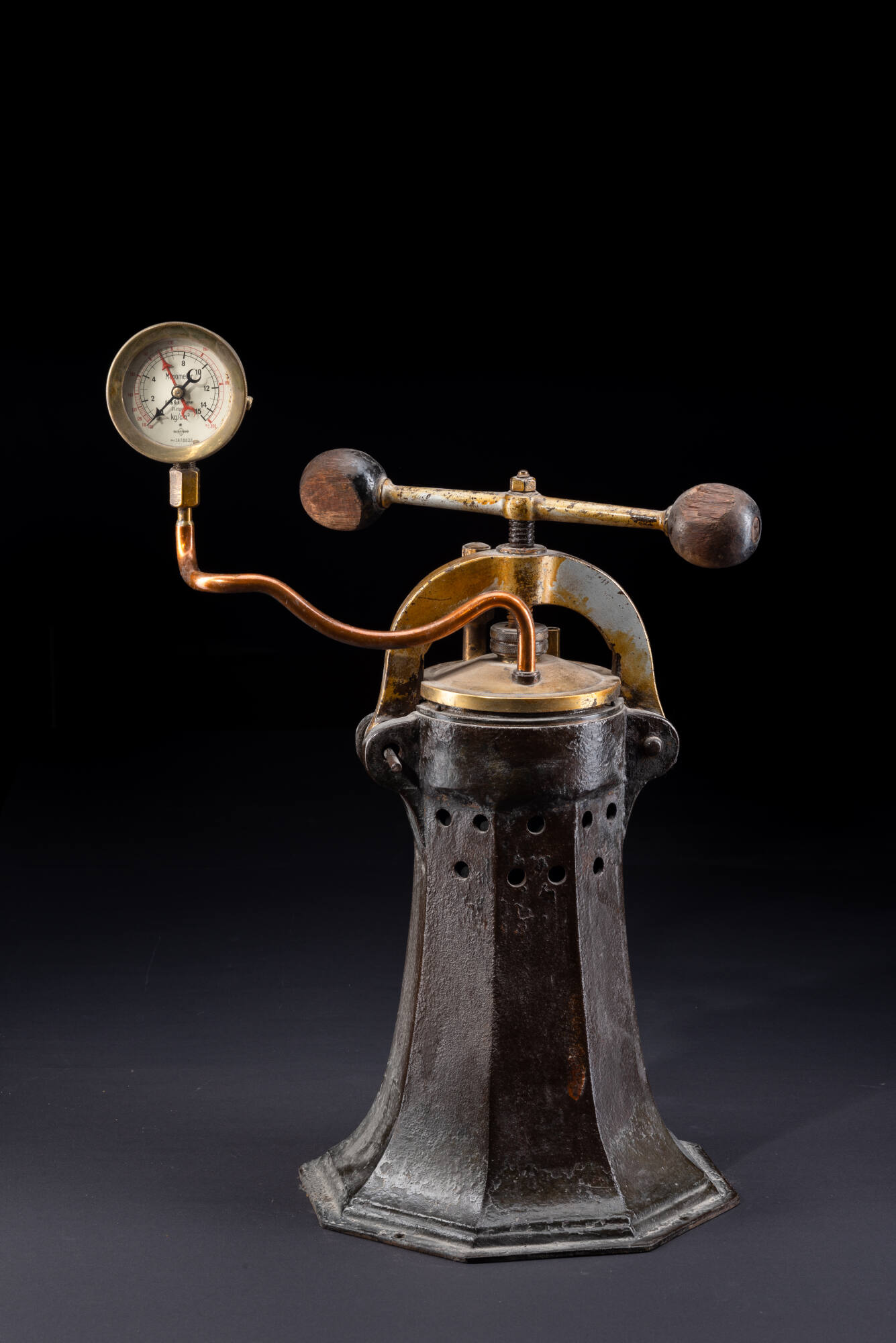 DescriptionDieser Vulkanisierkessel wurde von der Firma Jacob Brinzer Leipzig (JBL) hergestellt. Das Unternehmen wurde 1882 gegründet und zu Zeiten der DDR enteignet und verstaatlicht. Der Kessel hatte einen Druckausgleich mit Manometer, der von Ad. & Hch. Wagner in Stuttgart produziert wurde, die heute noch als Dental-Medizinische Großhandlung Dentalbedarf vertreibt. Der Bunsenbrenner ist liegend justiert und kann herausgezogen werden. Genutzt wurde die Apparatur zur Vulkanisation von Kautschukprothesen. Mit Hilfe von Rohkautschuk und Schwefel wurde bei der Vulkanisation ein Gummi erzeugt, das gegenüber dem Ursprungsmaterial deutlich belastbarer ist. Bei mechanischer Beanspruchung geht das Material in den ursprünglichen Zustand zurück und ist zudem reißfester, dehnbarer und beständiger gegen Abnutzung. Die klassische Vulkanisation wurde 1839 von dem amerikanischen Chemiker Charles Goodyear (1800–1860) erfunden. Seit 1864 stellte der Zahnarzt Thomas W. Evans (1823–1897) Kautschukprothesen mit Porzellanzähnen her.DimensionsH x B x T: 63 × 45 × 29 cm
