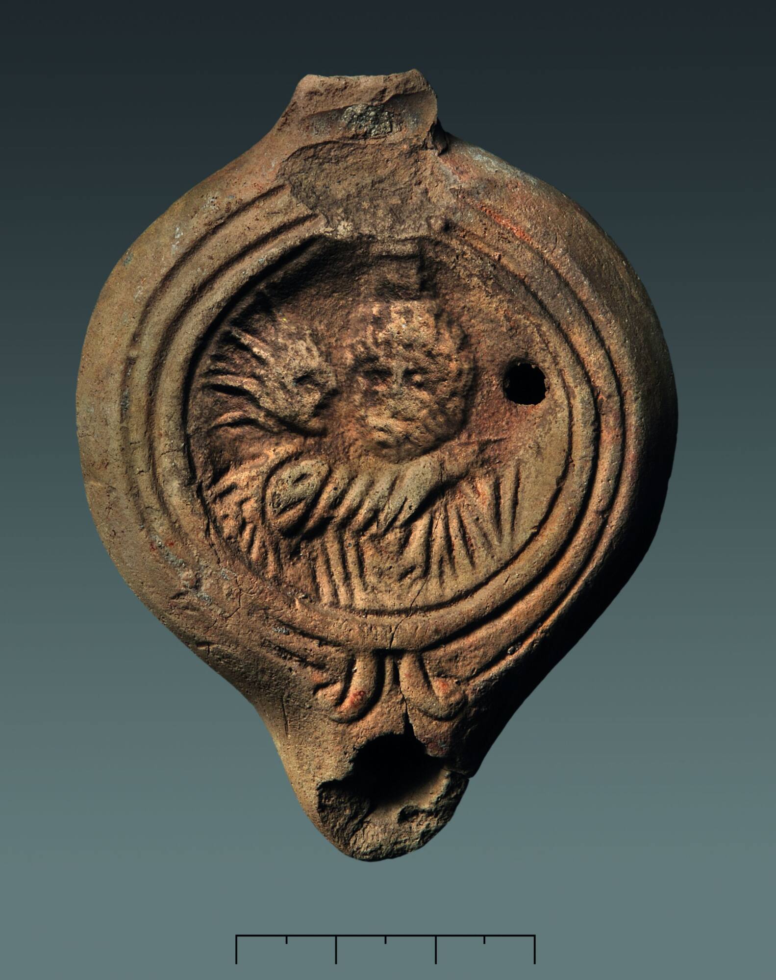 DescriptionEs war als hätt' der Himmel die Erde still geküßt: Das Bildmotiv der bescheidenen Lampe ziert ein sowohl homoerotisches als auch allegorisches und für eine Lampe überdies durchaus beziehungsreiches Motiv. Der Sonnengott Helios (Licht!) küßt den frontal aus dem Bild blickenden Serapis, in dem griechische und ägyptische Gottesvorstellungen (von Zeus und Hades einer-, von Osiris/Apis andererseits) verschmolzen sind. Ein christlicher Autor weiß von einem Ritual im Serapeion von Alexandria zu berichten, bei dem man "künstlich und mit Licht einige Vorrichtungen anstellte, so dass es aussah, als ob Sarapis vom Sonnengott geküßt wurde, wobei das Volk zusah". Die Tübinger Sammlung bestizt eine weitere Lampe mit dem gleichen Bilmotiv (inv. 6975).DimensionsDm 8,3 cm