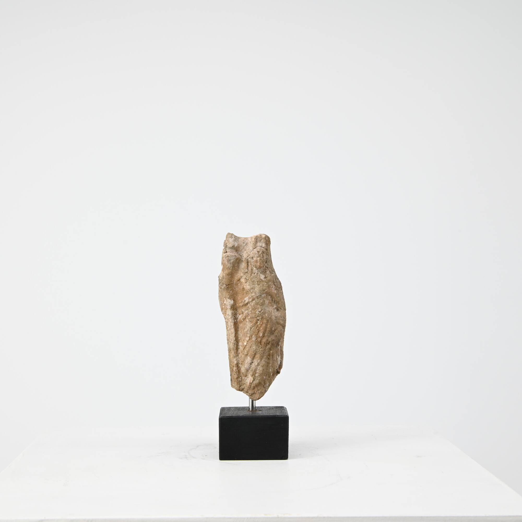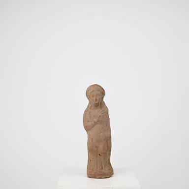 DescriptionFrontal und aufrecht stehende Demeter, die mit der rechten Hand eine große, senkrecht aufgestellte Fackel umfaßt. In der herabhängenden Linken hält sie ein kleines Ährenbündel. Demeter ist mit einem Chiton bekleidet und einem Mantelder mit einem Umschlag am oberen Rand schräg von der linken Schulter unter die rechte Achsel gewickelt ist. Von links ist er als Schleier über den Kopf gezogen. Gleichmäßige Falten gehen strahlenförmig von der rechten Achsel aus. Der
