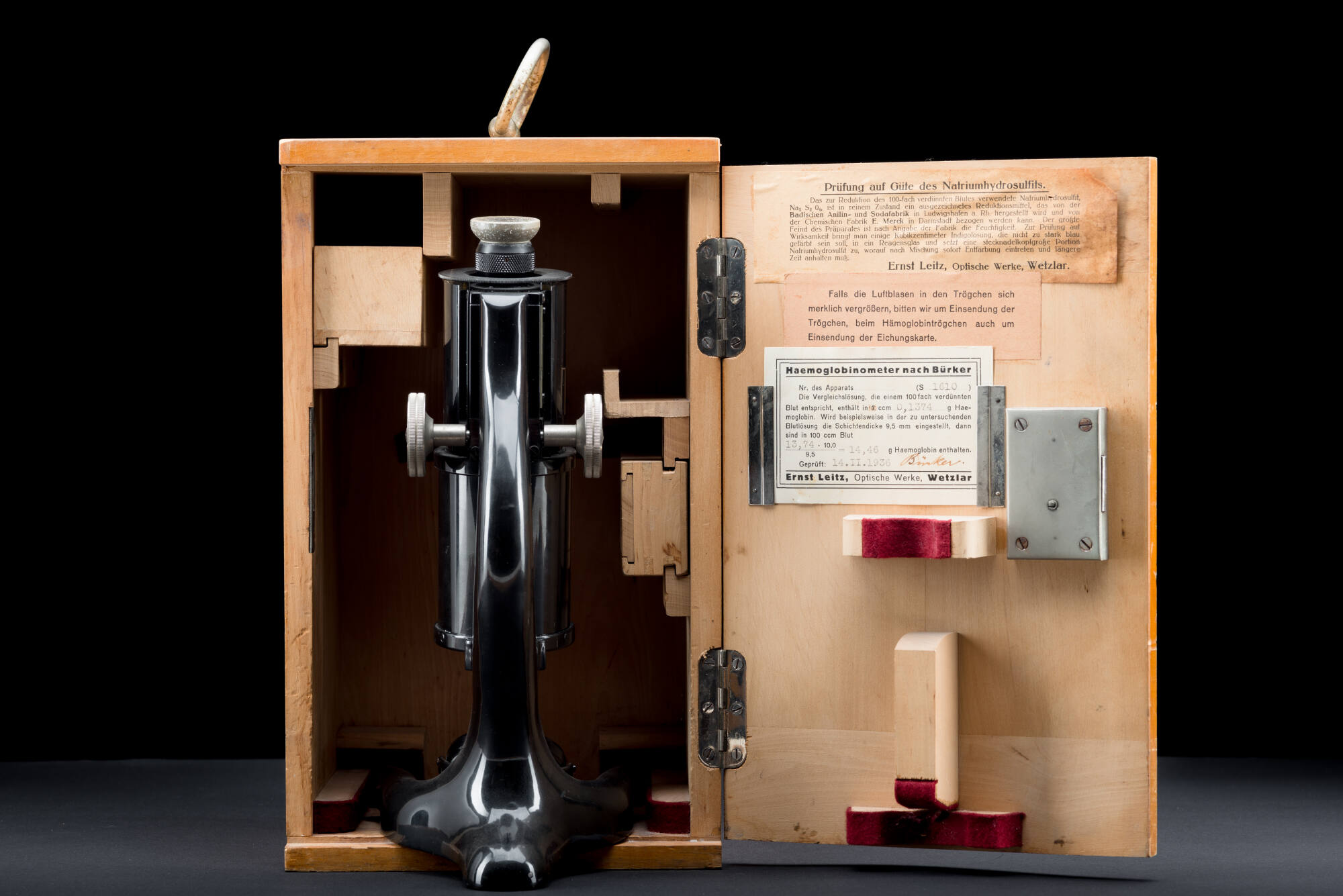 DescriptionDie Biochemische Gerätesammlung beherbergt historische Laborgeräte aus der Physiologischen Chemie, wie das Fach früher hieß. Aus der Zeit des Physiologisch-Chemischen Instituts in der Gmelinstraße (1886 bis 1964) stammen zum Beispiel Spezialinstrumente zur Hämoglobin-Forschung, wie dieser Hämoglobinmeter nach Bürker, samt Aufbewahrungskiste aus dem Jahre 1936.Object numberMNF-Bc-13