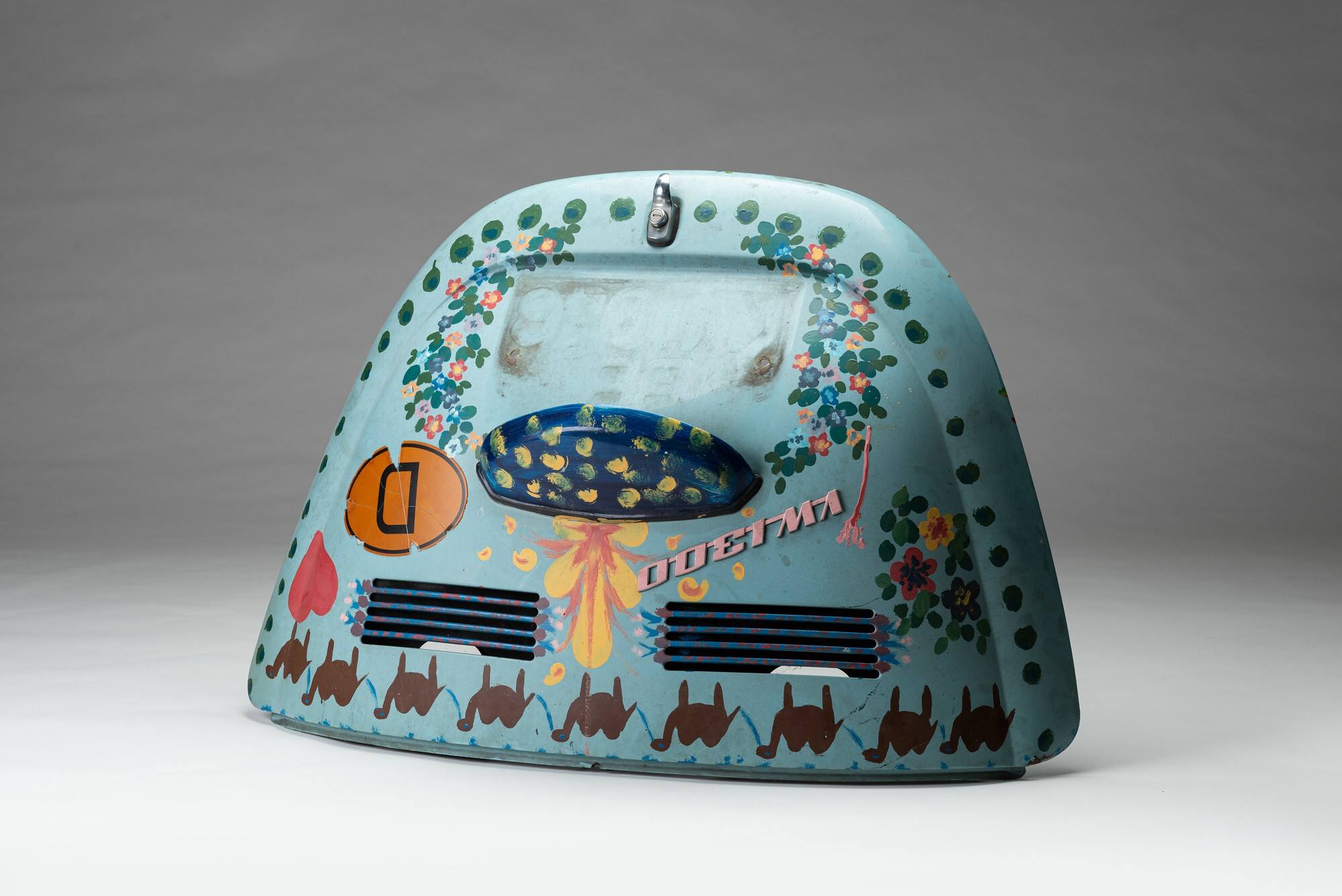 DescriptionDie Motorhaube stammt von einem VW-Wagen. Sie ist blau lackiert und mit einem floralen Muster, Kamelen und Punkten bunt bemalt. Im Jahre 1986 wurde sie dem Ludwig-Uhland-Institut geschenkt, um in der Ausstellung "Volkskunde heute" (1968) exponiert zu werden. 2021 wurde das Objekt ein zweites mal zum Exponat in der Ausstellung "Sachgeschichte als Fachgeschichte".DimensionsHöhe: 77 cm, Breite: 105 cm