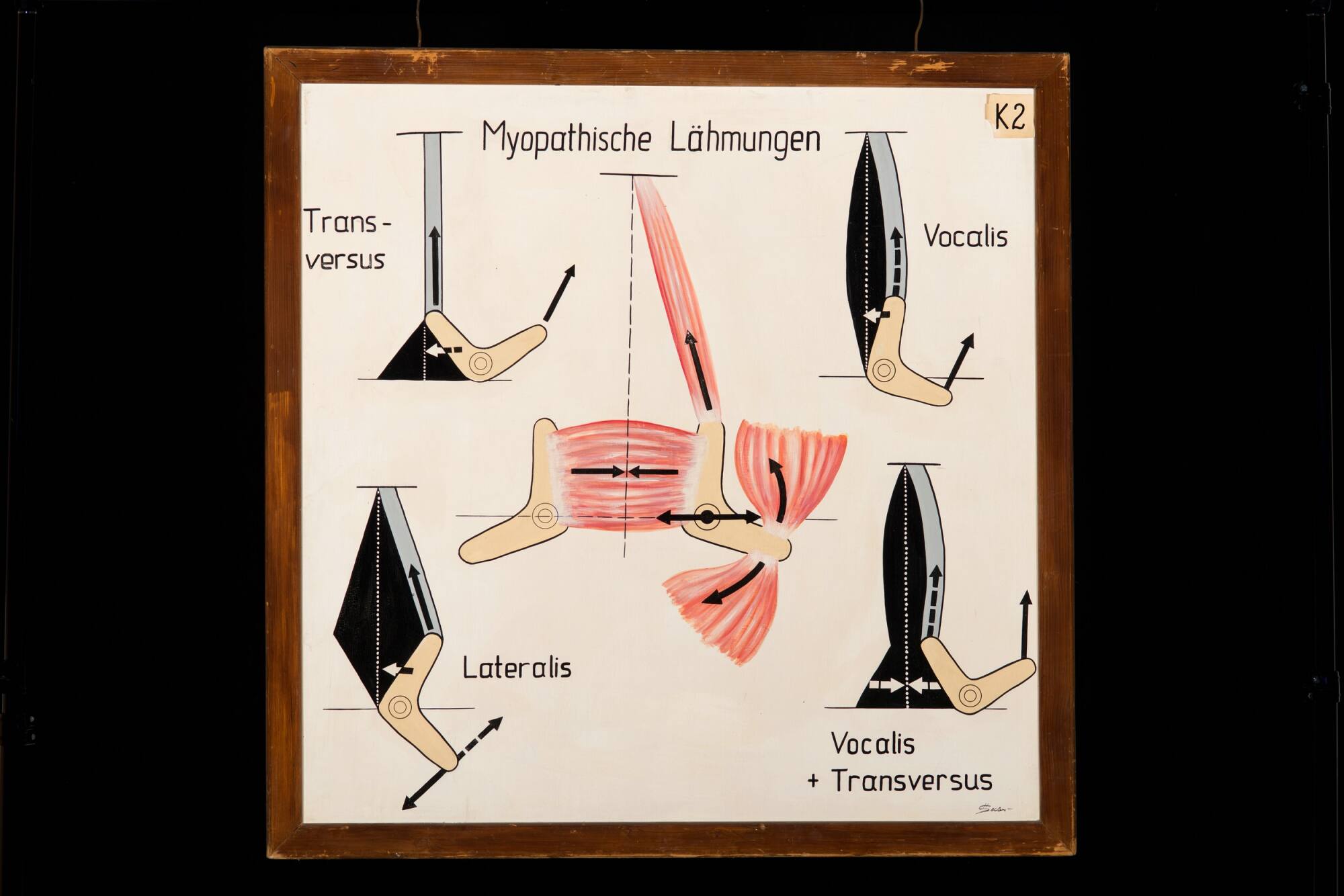 DescriptionNeben Lähmungen, die durch Schädigung der Nerven verursacht sind, können auch Muskelerkrankungen zu Lähmungen im Kehlkopf führen. Kommt es zu einem Ausfall der Kehlkopfmuskulatur, so resultieren daraus je nach betroffenem Muskel unterschiedliche Fehlstellungen der Stimmbänder oder der Stellknorpel. Dies kann zu Heiserkeit bis hin zu Atemnot führen.DimensionsH x B: 142 × 142 cm