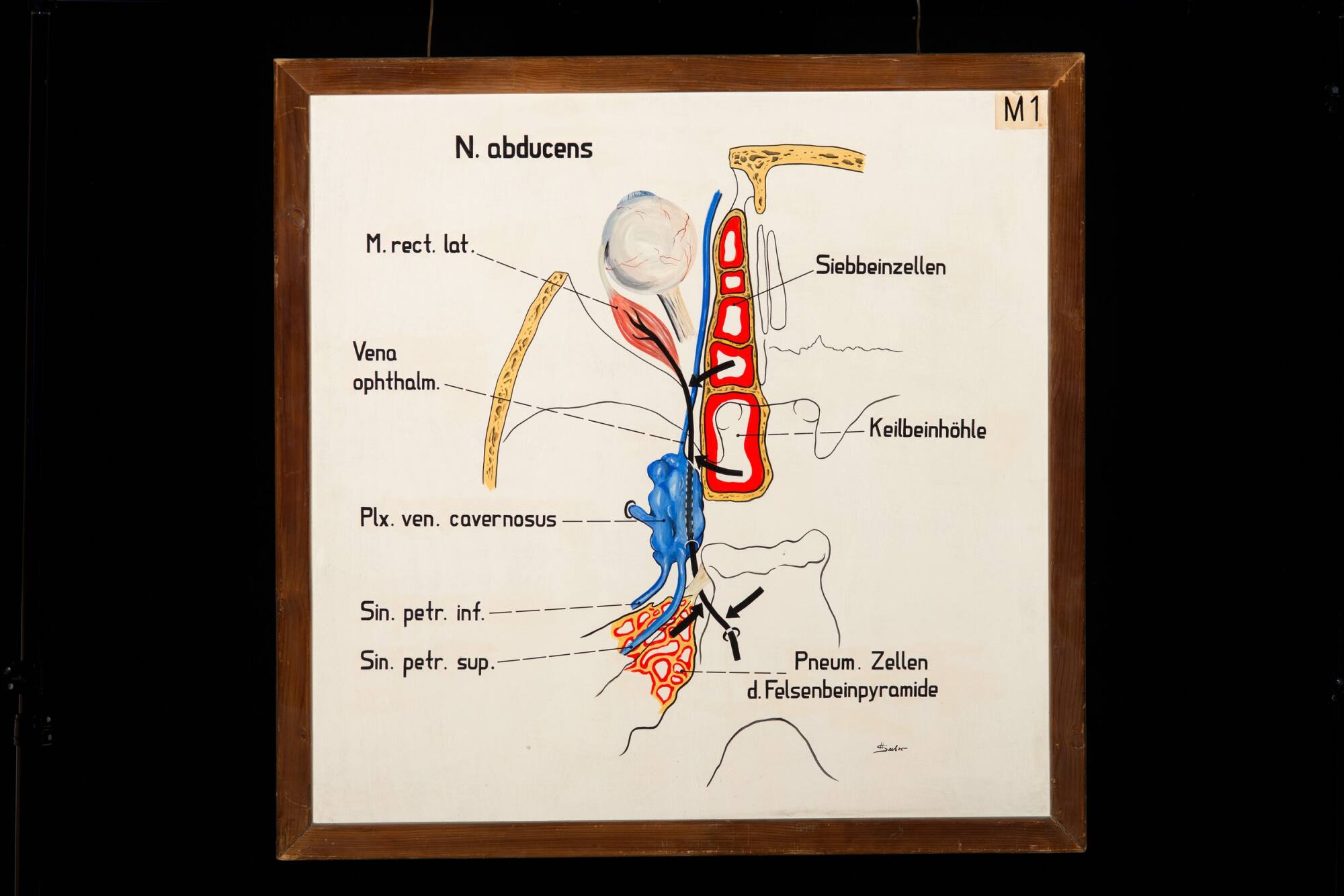 DescriptionDer Nervus abducens (VI. Hirnnerv) tritt im Bereich der pneumatisierten Zellen der Felsenbeinpyramide durch die harte Hirnhaut (Dura mater) und verläuft anschließend in einem Gefl echt aus venösen Blutleitern (Plx. ven. cavernosus, heute als Sinus cavernosus bezeichnet). Dieses Geflecht nimmt Blut aus verschiedenen venösen Blutleitern des Hirns (wie Sinus petrosus inferior und superior) und der Venen der Augenhöhle (Vena ophthalmica, heute unterteilt ins superior und inferior mit teilweise unterschiedlichem Abfluss) auf. Gemeinsam mit den Venen der Augenhöhle tritt der Nervus abducens durch die knöcherne Begrenzung in die Augenhöhle aus und innerviert dort den Musculus rectus lateralis, der für die Auswärtsdrehung des Auges zuständig ist.DimensionsH x B: 142 × 142 cm