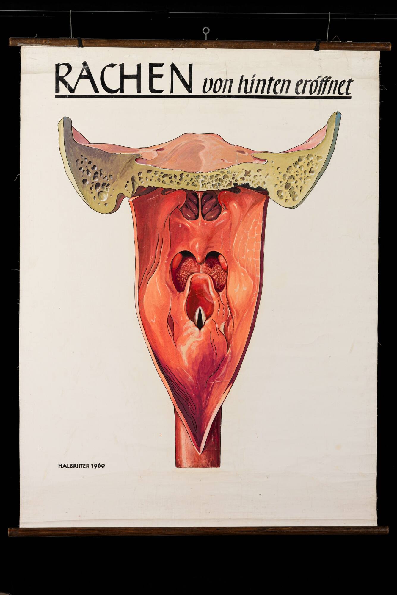 DescriptionUnterhalb der knöchernen Schädelbasis ist der eröffnete gesunde Rachen von hinten zu sehen. Von oben nach unten sind die Öffnungen der Nasenhöhle zum Rachen hin (Choanae), das Zäpfchen (Uvula), die Gaumensegel mit den Gaumenmandeln (Tonsillen) und die hinteren Anteile der Zunge zu erkennen. Anschließend der Kehldeckel (Epiglottis) mit den Stimmlippen und die eröffnete Speiseröhre (Ösophagus).DimensionsH x B: 135 × 98 cm