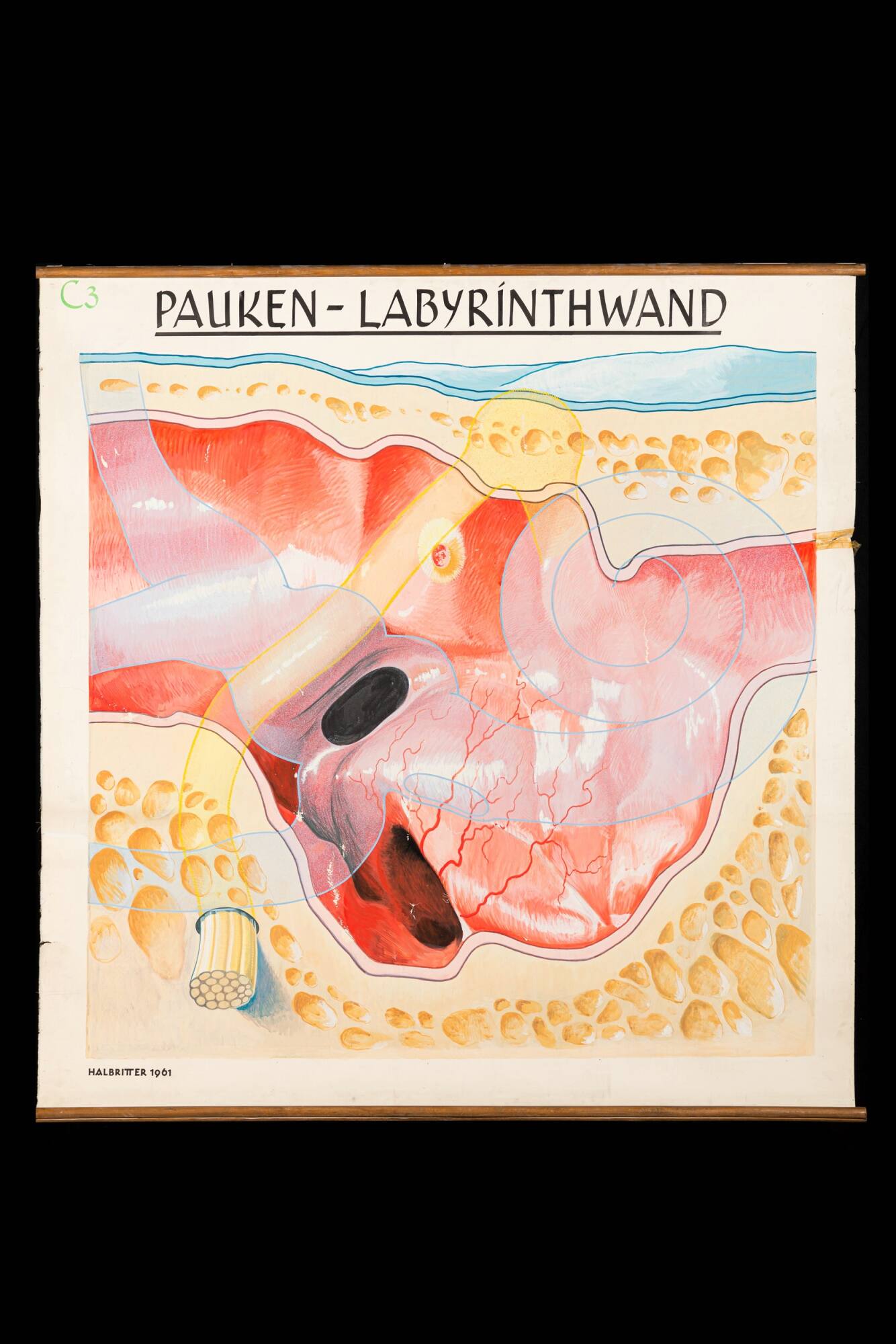 DescriptionIn dieser schematischen Übersicht ist ein rechtes Mittelohr dargestellt, nach dem die Gehörknöchelchen, die Paukensaite (Chorda tympani) und die Muskeln des Mittelohres (Musculus stapedius und Musculus tensor tympani) entfernt wurden. Man erkennt das ovale Fenster (tief schwarz dargestellt), welches von der Fußplatte des Steigbügels verschlossen wird. Darunter ist die Rundfensternische zu erkennen. In blass-blau sind die Strukturen des Innenohres angedeutet, die hinter der dargestellten knöchernen Wand ruhen. In Gelb dargestellt ist der Verlauf des Gesichtsnervs (Nervus facialis).DimensionsH x B: 158 × 150 cm