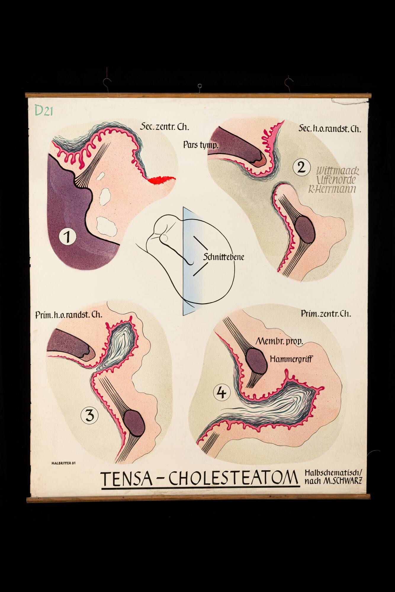 DescriptionDas Tensa-Cholesteatom (Perlgeschwulst) entsteht durch einen Adhäsivprozess im Bereich der straff gespannten Anteile (Pars tensa) des Trommelfells. Geht dem Cholesteatom etwa ein Loch (Perforation) des Trommelfells voraus, spricht man von einem sekundären oder erworbenen Cholesteatom, das sich sowohl zentral als auch randständig ausbreiten kann (1+2). Ohne vorhergehende Perforation oder andere Erkrankungen des Trommelfells spricht man von einem primären oder auch genuinen Cholesteatom, das sich ebenfalls zentral oder randständig ausbreiten kann (3+4).DimensionsH x B: 180 × 150 cm