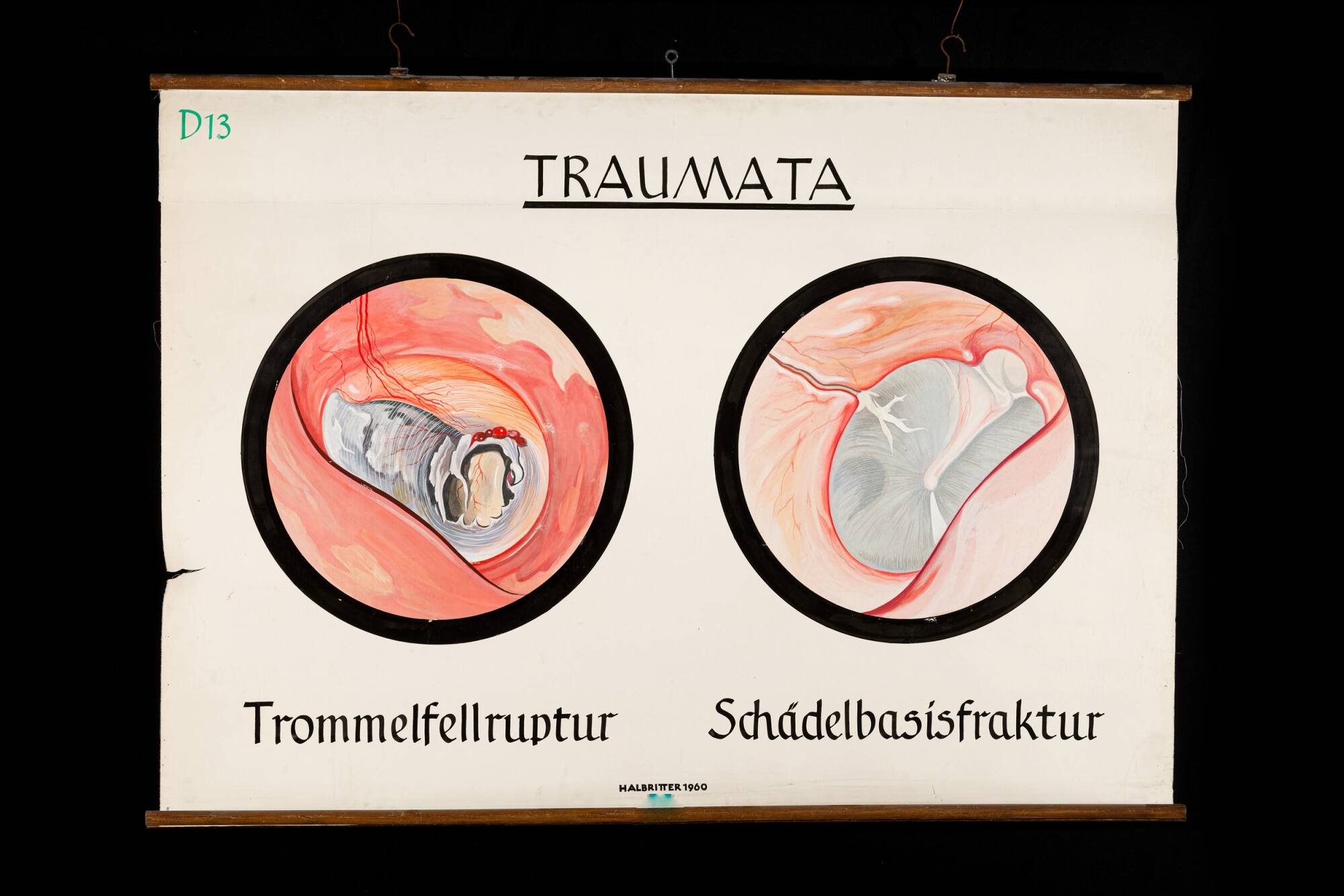 DescriptionDurch von außen einwirkende Gewalt kann es zu Verletzungen kommen, die je nach Mechanismus unterschiedliche Folgen haben. Eine häufige Verletzung in der Hals-Nasen-Ohrenheilkunde ist die Trommelfellruptur, also ein Zerreißen der Membran. Diese entsteht in der Regel durch direkte Gewalteinwirkung (etwa Schlag mit der flachen Hand auf das Ohr oder Verletzungen bei Gehörgangreinigung mit Wattestäbchen). Bei Stürzen auf den Kopf kann es zu Schädelbasisbrüchen mit Schädigung des Hör- und Gleichgewichtsorganes kommen. Teilweise kann der Bruchspalt im Gehörgang beobachtet werden (Felsenbeinlängsfraktur).DimensionsH x B: 109 × 149 cm
