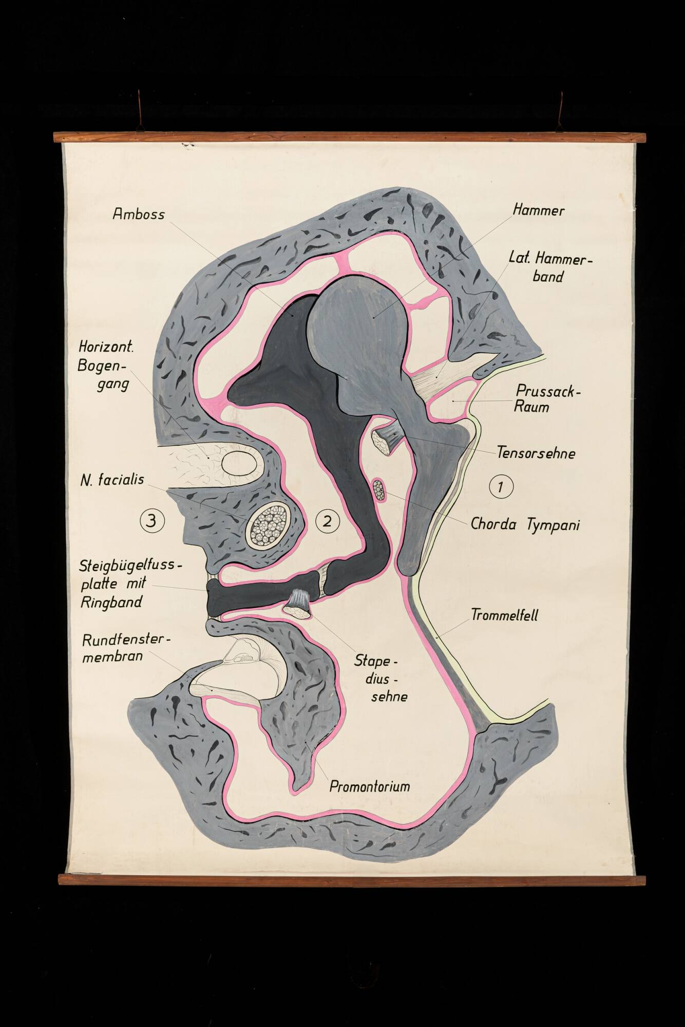 DescriptionIn rosa-violett markiert sind die mit der Schleimhaut (Tunica mucosa) des Mittelohres (Auris media) überzogenen Flächen. Am Trommelfell (rechts im Bild) befindet sich eine Grenzschicht zwischen der Schleimhaut und der Haut (Plattenepithel, blass-gelb markiert) des äußeren Gehörgangs.DimensionsH x B: 159 × 119 cm