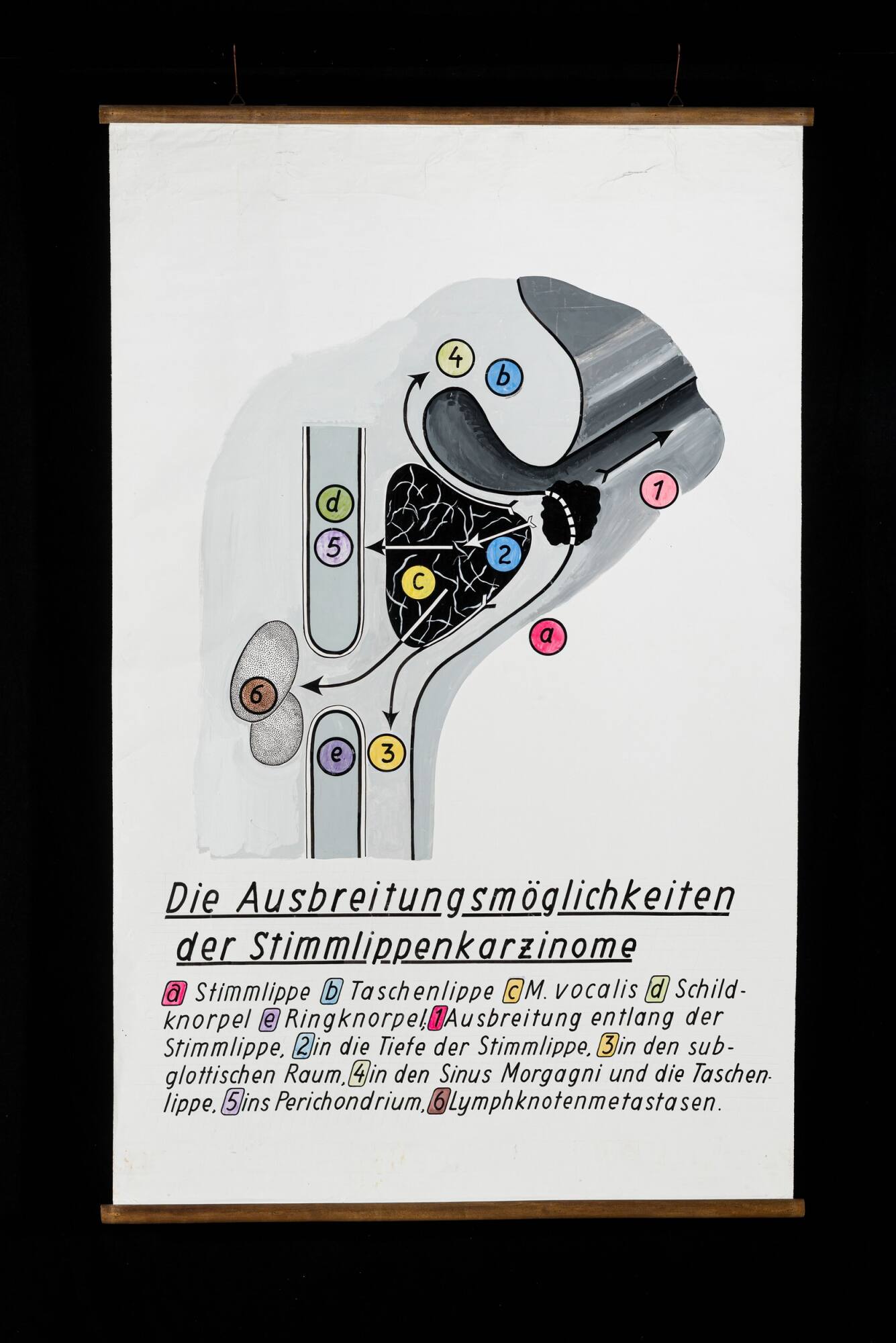 DescriptionBilden sich bösartige Tumore an den Stimmlippen, so können sich diese in verschiedene Richtungen ausbreiten: Entlang der Stimmlippen selbst, in die Falten des Kehlkopfes, in den knorpeligen Anteil oder als Metastase in die Lymphknoten. Fernmetastasen kommen auch in der Leber vor. Meist handelt es sich um Plattenepithelcarcinome. Rauchen und Alkohol gilt als einer der größten Risikofaktoren für Krebserkrankungen im Kehlkopfbereich, immer noch sind mehr Männer als Frauen betroffen. Die Prognose ist stark von der Tumorgröße, Lokalisation und Metastasierung bei der Erstdiagnose abhängig.DimensionsH x B: 162 × 100 cm