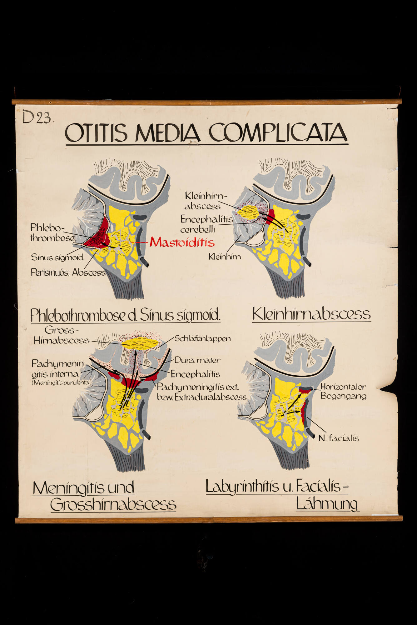 DescriptionEine Komplikation einer Mittelohrentzündung (Otitis media) ist die Entzündung des eigentlich luftgefüllten Warzenfortsatzes (Processus mastoideus). Unter anderem von diesem kann sich die Entzündung weiter ausbreiten und die hier gezeigten Komplikationen hervorrufen. Eine Thrombose des Sinus sigmoideus (venöser Blutleiter), eine Eiteransammlung (Abszessbildung) im Klein- oder Großhirn mit begleitender Hirnhautentzündung (Meningitis) oder eine Schädigung des Gesichtsnervss (Nervus facialis) mit Beteiligung des Bogengangsystems sind möglich.DimensionsH x B: 165 × 150 cm