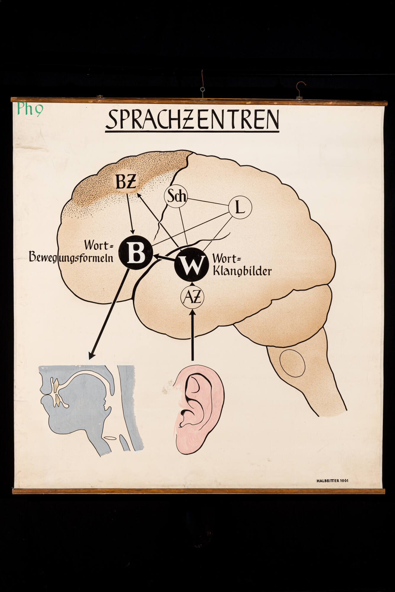 DescriptionDie Tafel zeigt eine schematische Darstellung der Lage der verschiedenen Sprachzentren im Gehirn. Das Wernicke-Areal (W) befindet sich im Temporallappen und ist für das Sprachverständnis zuständig. Das Broca-Areal (B) befindet sich im Frontallappen und koordiniert die Sprachbildung. Weitere Strukturen in unterschiedlichen Bereichen des Gehirns sind ebenfalls an der Sprachverarbeitung beteiligt.DimensionsH x B: 156 × 150 cm