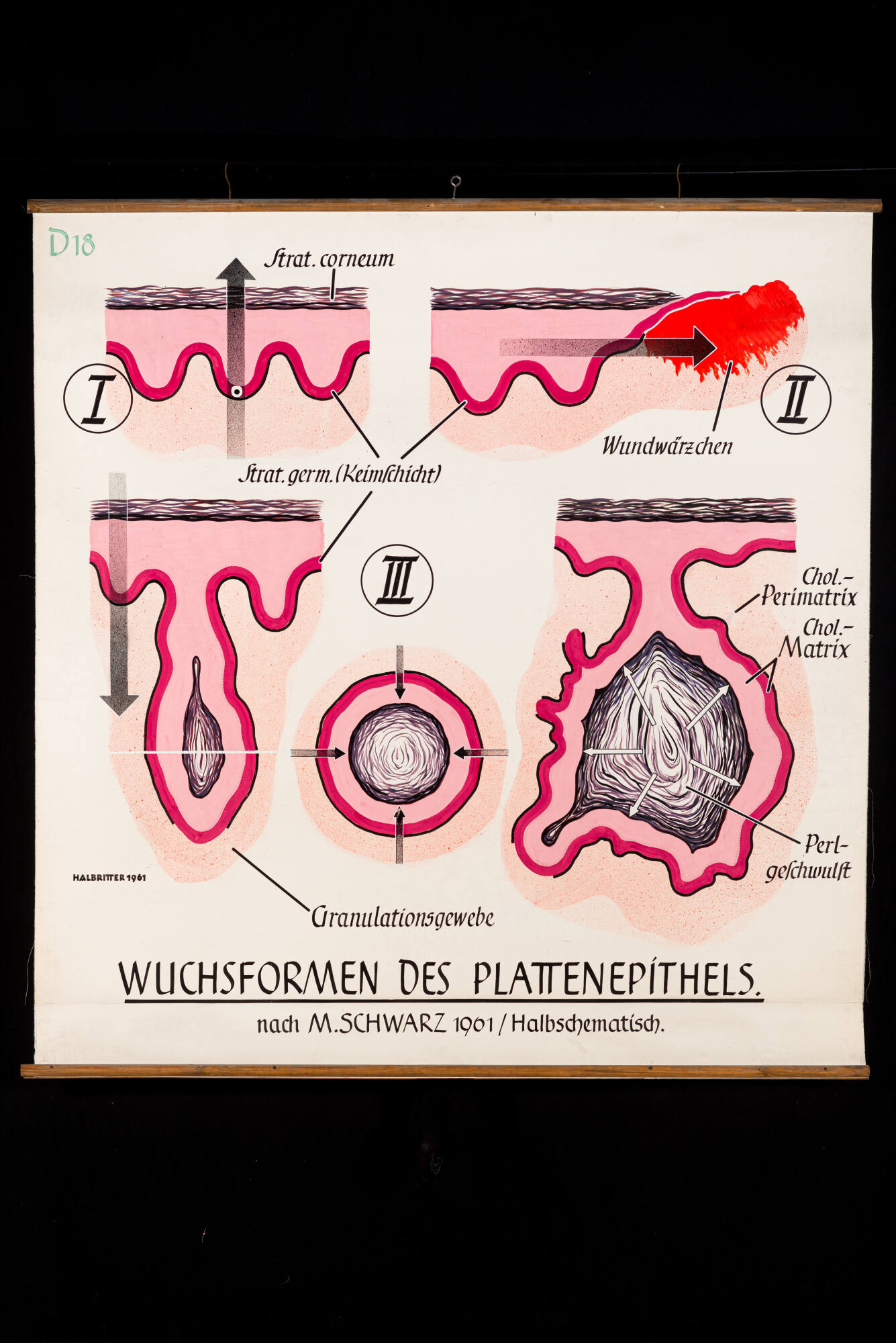 DescriptionSchematisch dargestellt ist das Entstehen eines Perlgeschwulsts (Cholesteatom) nach Max Theodor Schwarz (1898–1991, deutscher HNO-Arzt). Im gesunden Zustand wächst das Plattenepithel in einer definierten Richtung von den tiefen (basalen) Schichten bis hin zu den oberflächlichen (superfiziellen) Schichten. An der Basis befindet sich die Keimschicht (Stratum germinativum). Von hier aus differenziert sich die Haut über verschiedene Zwischenstufen hin zur Hormonzellschicht (Stratum corneum, I). Zum Beispiel im Rahmen von Verletzungen kann es zur Aufhebung der Schichtung kommen (II). Durch eine Defektheilung kann es zu Einziehungen und Versenkungen kommen. Die Wuchsrichtung des Plattenepithels wird aufgehoben. Die Versenkung des Wuchses wird schließlich zu einem Perlgeschwulst (Cholesteatom, III).DimensionsH x B: 155 × 150 cm
