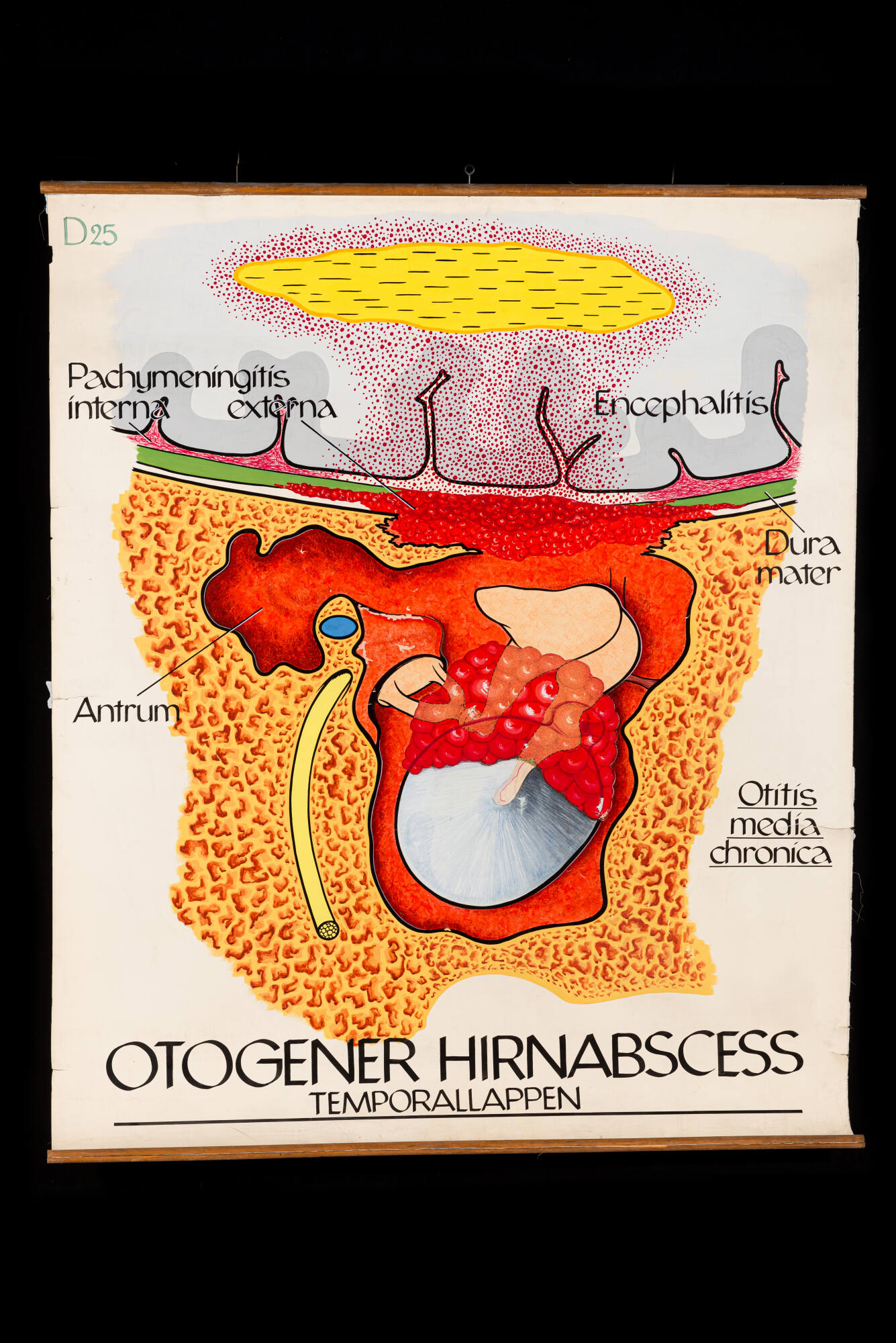 DescriptionEine Komplikation einer akuten oder chronischen Mittelohrentzündung (Otitis media acuta/chronica) ist der vom Ohr ausgehende (otogene) Hirnabszess des Schläfenlappens (Lobus temporalis). Dabei durchbricht die Entzündung den Knochen und breitet sich auf die Hirnhäute (Pachymeningitis interna und externa) und das Hirngewebe (Encephalitis) aus. Im Hirngewebe kann es zur Ansammlung und Abkapselung von Eiter kommen (Hirnabszess).DimensionsH x B: 182 × 150 cm