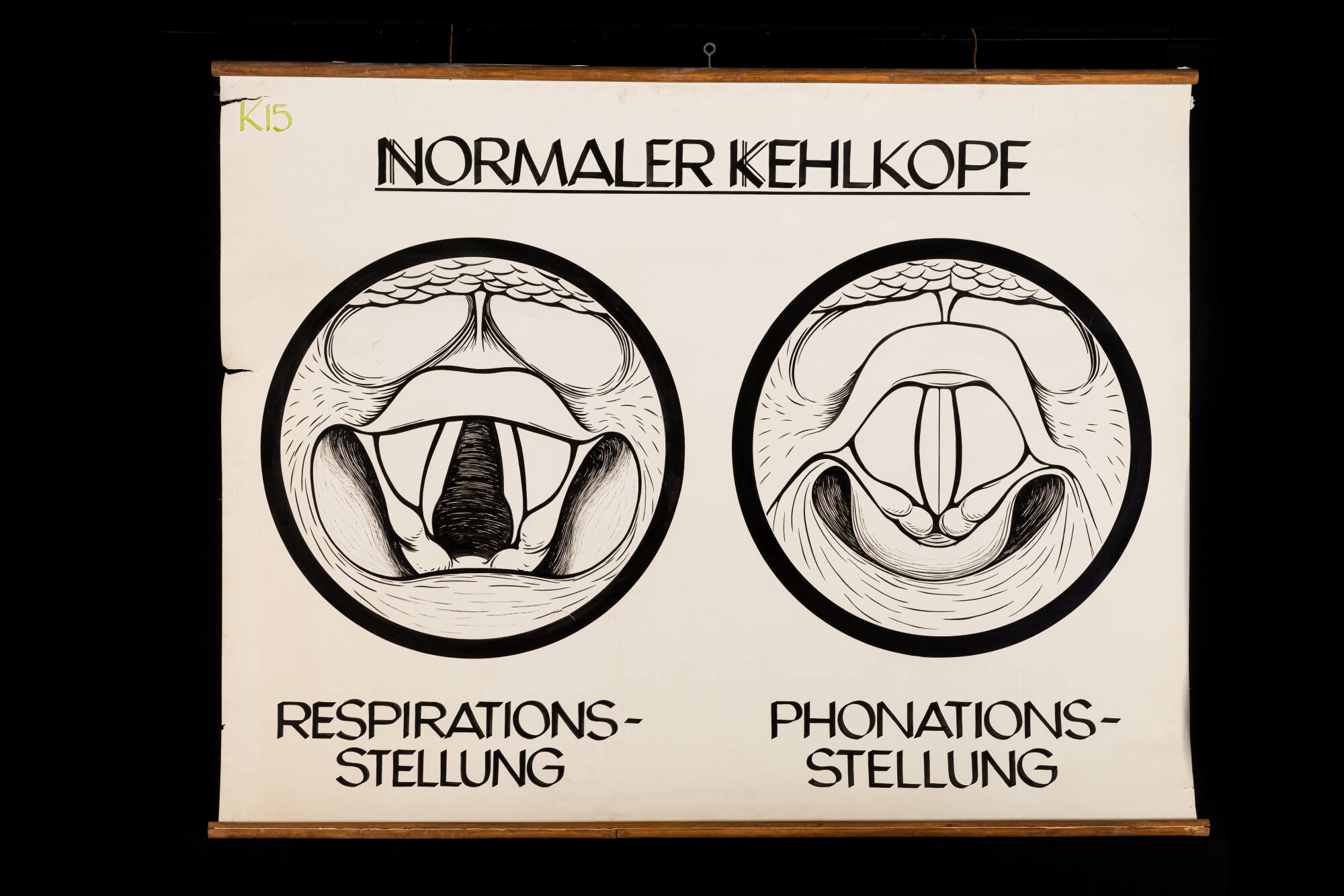 DescriptionIn der Kehlkopfspiegelung kann die Stimmritze sowohl in Atemstellung als auch in Sprechstellung (Phonationsstellung) dargestellt werden. Über die beweglichen Stellknorpel wird die Weite und Spannung der Stimmlippen reguliert. Bei der Atmung wird der Kehlkopf weit gestellt und damit eine freie Öffnung für den Luftstrom geschaffen. Zur Tonerzeugung werden die Stimmlippen geschlossen und durch die Ausatemluft bildet sich unterhalb der Glottis ein Druck, der, wenn er ausreichend groß ist, die Stimmlippen wieder öffnet. So entsteht ein Luftstrom. Der Glottisquerschnitt ist kleiner als der Querschnitt oberhalb und unterhalb des Glottisspalts, dies erhöht die Geschwindigkeit des Luftstroms. Da die resultierenden Bernoulli-Kräfte zusammen mit der Rückstellkraft der Stimmlippen die Kraft des subglottalen Druckes übertreffen, schließt sich die Glottis und der Zyklus beginnt von vorn. So entsteht die menschliche Stimme.DimensionsH x B: 117 × 140 cm