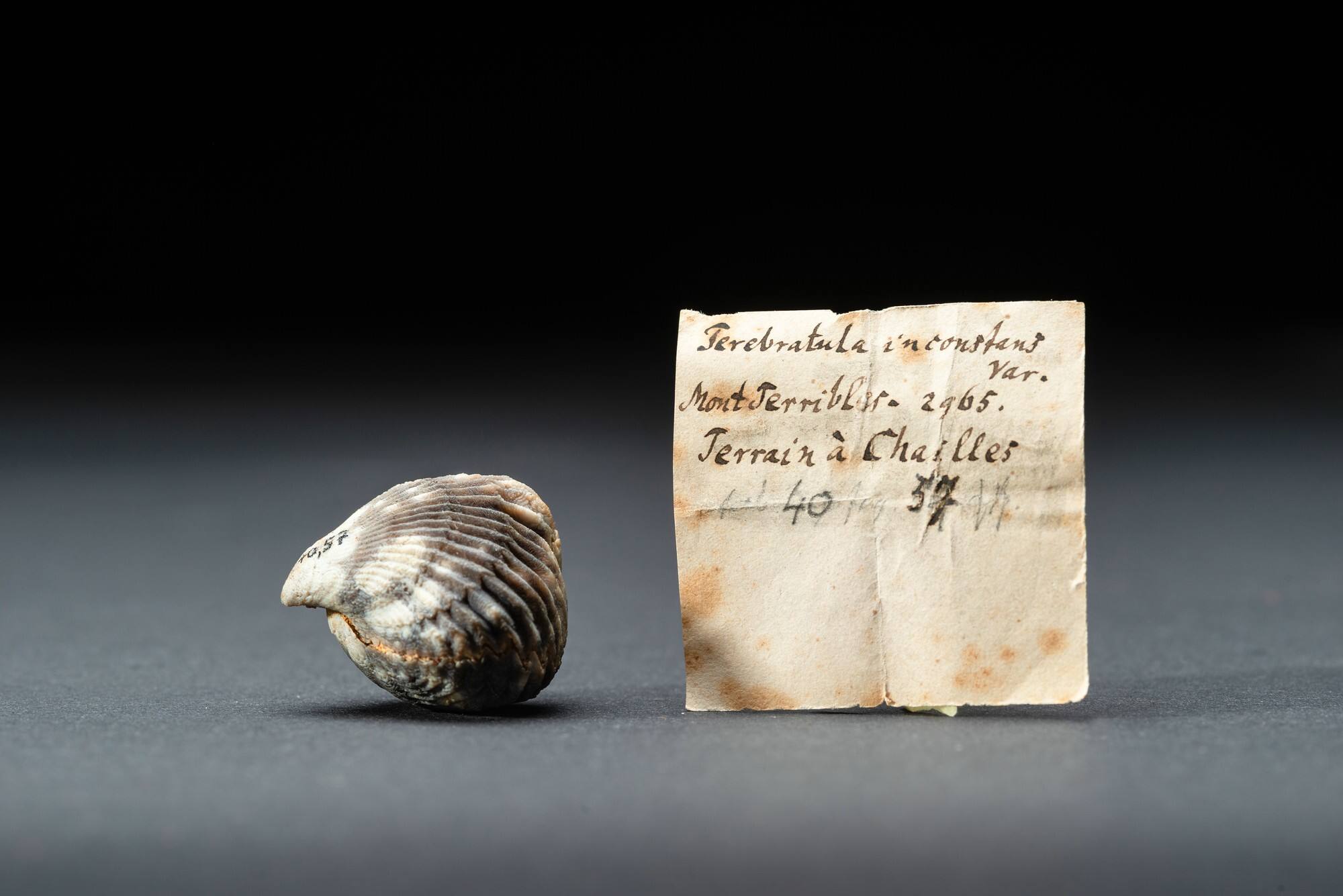 Description„Terebratula“ inconstans (QUENSTEDT 1871), syn. Torquirhynchia inconstans (SOWERBY 1821) (Brachiopoda); spätes Jura, Bärschwil-Formation (Terrain à Chailles): 200 bis 150 Millionen Jahre; Kanton Jura (Département Mont-Terrible, ehemals Frankreich), Schweiz; 1844 gefunden auf der Exkursion von Friedrich August Quenstedt in die Vogesen und das Schweizer Jura; Inv.-Nr. GPIT-PV-30089 (syn. PV 2965).Object numberGEO-Ps-GPIT-PV-30089