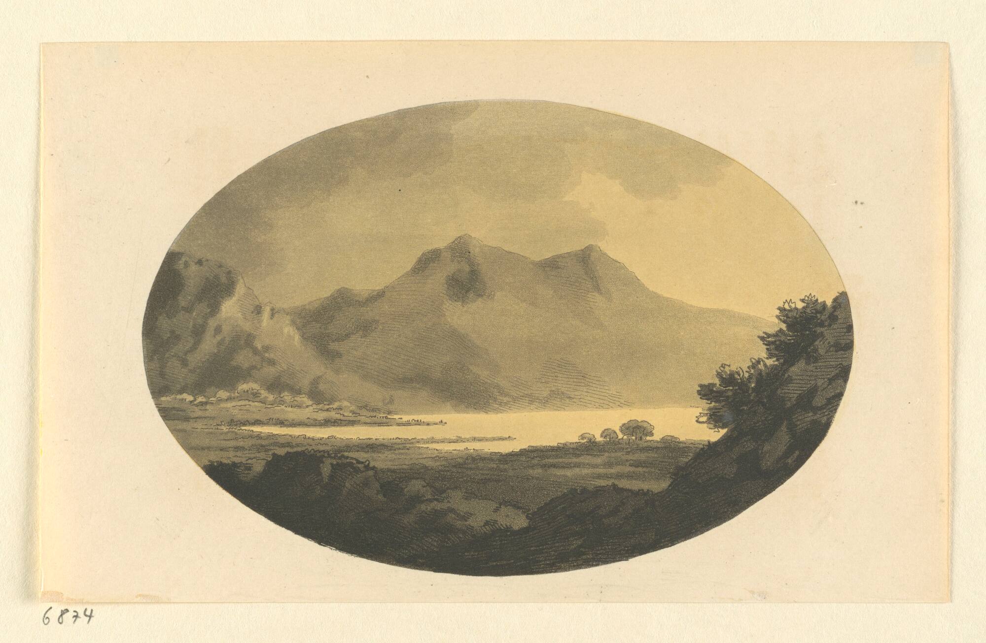 DescriptionLandschaftsdarstellung in ovaler Bildform mit Fluss und Bergen.DimensionsH x B (Blatt): 133 × 215 mm