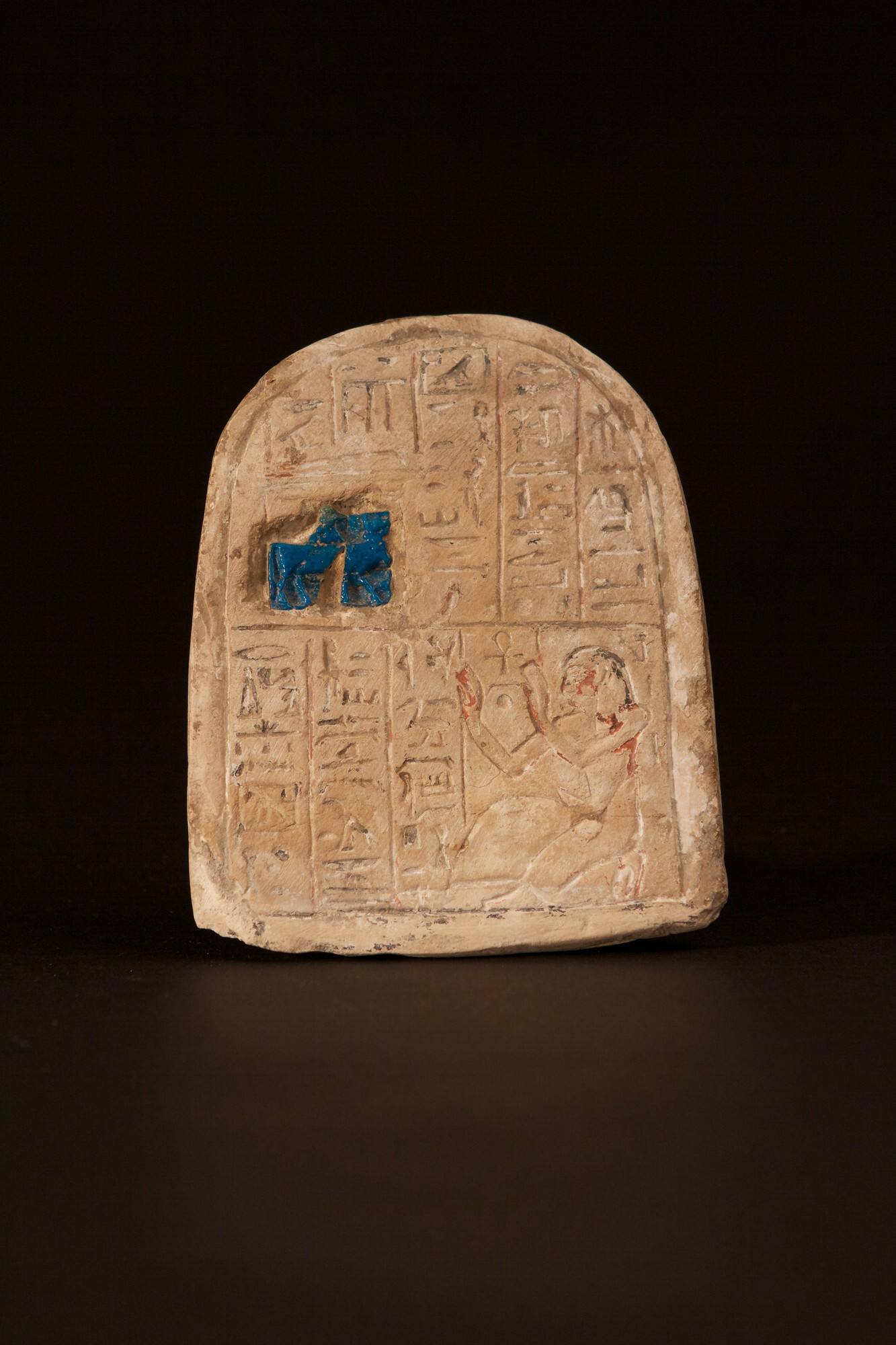 DescriptionKleine Votivstele in zwei Registern: oben befindet sich links in einem auf der Stele eingeritzten Schrein eine aus blauer Fayence gefertigete Hathorkuh umgeben von fünf Kolumnen Text. Im unteren Register sieht man rechts den knienden Ramose im Adorationsgestus, nach links schaunend. Vor ihm befinden sich drei Kolumnen Text. Im Bildfeld sind ebenfals zwei zwei Kolumnen eingebracht worden. Reste einer farbingen Fassung, vor allem im Gesicht sichtbar, haben sich erhalten.DimensionsH x B x T: 13,5 × 11 × 3 cm