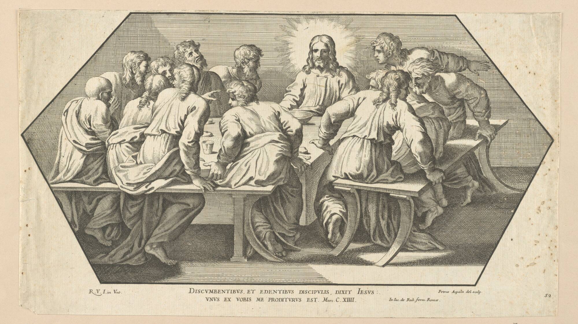 DISCVMBENTIBVS , ET EDENTIBVS DISCIPVLIS , DIXIT IESVS : / VNVS EX VOBIS ME PRODITVRVS EST . Marc. C. XIIII.