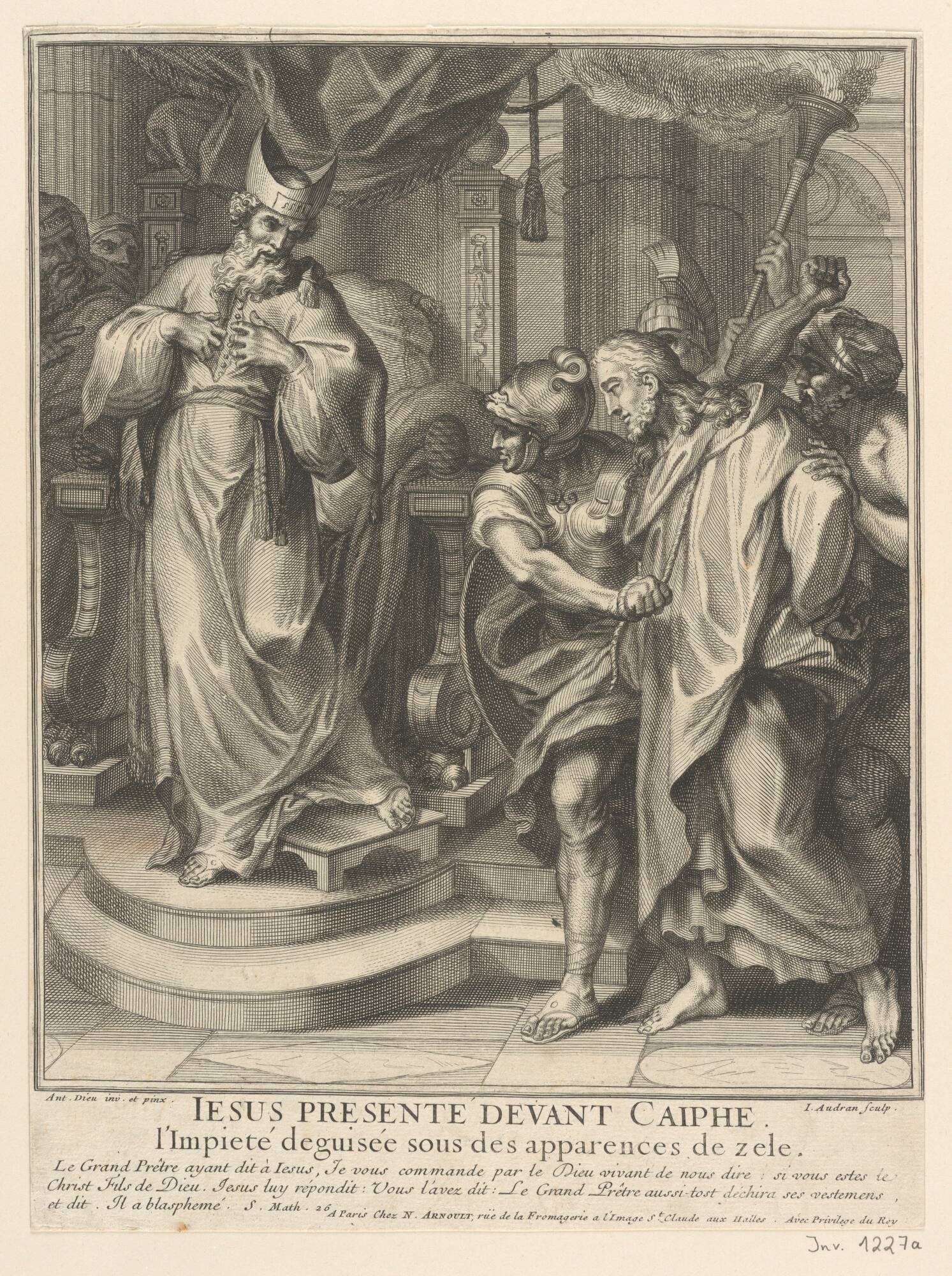 Le Grand Prêtre ayant dit à Iesus, Je vous commande par le Dieu vivant de nous dire : si vous estes le / Christ Fils de Dieu. Jesus luy répondit : Vous l'avez dit : Le Grand Prêtre aussi tost déchira ses vestements, / et dit. Il a blasphemé. S. Math. 26