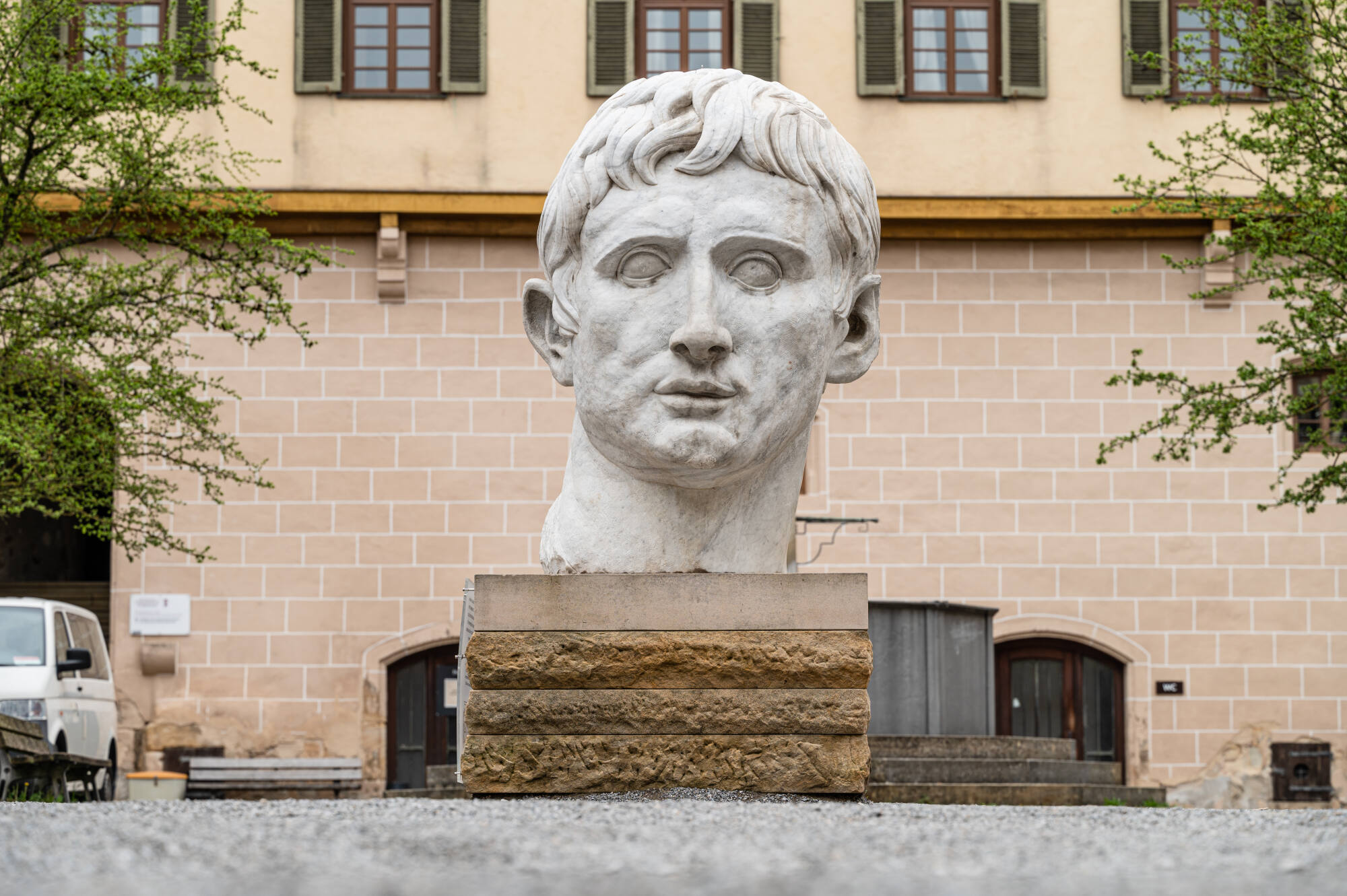 DescriptionAuf dem Sterbebett soll sich der römische Kaiser Augustus mit einer seinerzeit üblichen Bühnenformel verabschiedet haben: „Wenn Euch alles gut gefallen hat, dann spendet Applaus und entlasst uns allesamt mit Freuden.“ Der Meister der politischen Kommunikation, der eine krisengeschüttelte Republik unter Wahrung der äußeren Form in eine militärisch gestützte Monarchie umgewandelt hatte, wusste um den Wert der Inszenierung. Geschickt inszeniert ist auch der Porträtkopf des Augustus, der allen entgegenblickt, die den Schlosshof auf Hohentübingen betreten. Die Präsenz, die das Bildwerk im großzügigen Geviert des Hofes entwickelt, verdankt sich neben der Qualität der Ausführung sicher auch seinen wuchtigen Dimensionen: Mit einer Höhe von 172,5 cm entspricht der knapp fünf Tonnen wiegende Kopf aus Carrara-Marmor dem Maßstab einer Statue von etwa 10,5 m Gesamthöhe. Wie viele antike Bildwerke weist er Spuren von Unfertigkeit auf. Gleichwohl dürften etwa 1000 Arbeitsstunden in seine Herstellung geflossen sein, so die Schätzung des Steinmetzen und Archäologen Michael Pfanner (geb. 1955), dem sich die ausführlichste Auseinandersetzung mit dem Kopf verdankt.