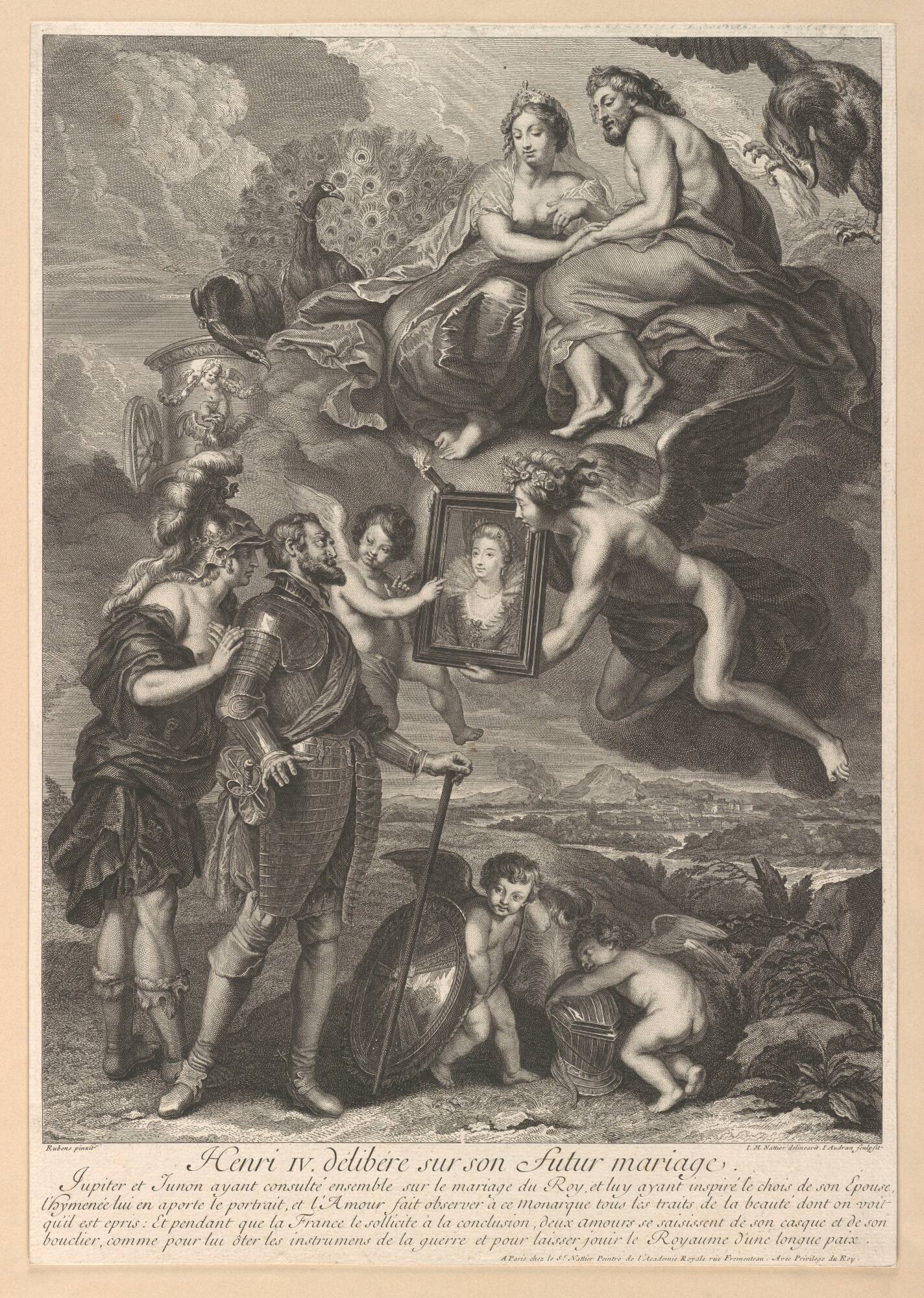 DescriptionStich nach einem Gemälde des 24 Werke umfassenden Medici-Zyklus von Rubens: Heinrich IV. erhält das Bildnis seiner zukünftigen Gattin Maria von MediciDimensionsH x B (Blatt): 505 x 351 mm