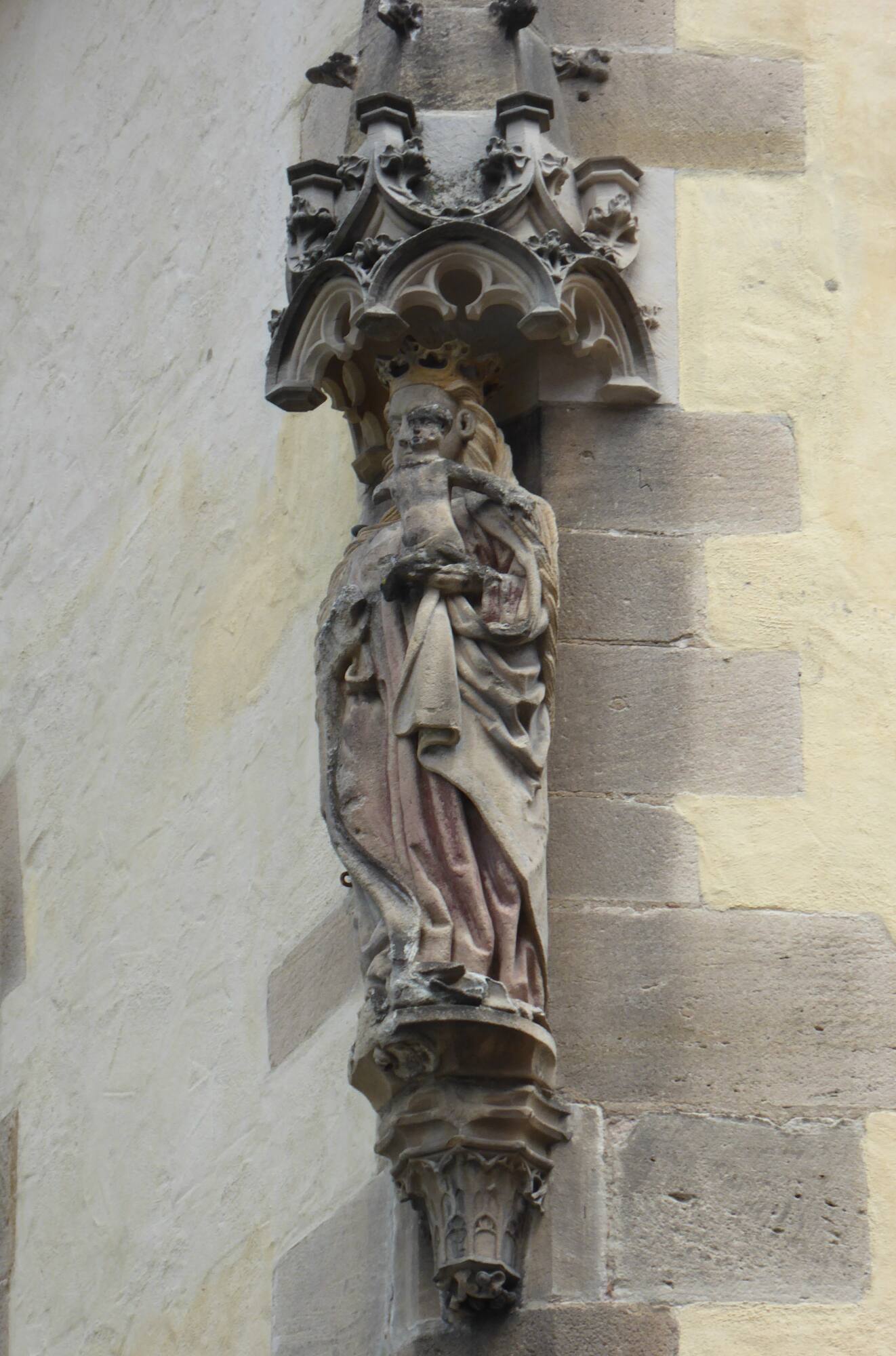 DescriptionDie Gebäude des Bebenhäusener Pfleghofes, die anfänglich im Besitz des Zisterzienserordens waren, bilden nach Westen einen stumpfen Winkel. Die dortige Hausecke liegt genau in der Blickachse des Holzmarkts und der Stiftskirche, so dass sie für alle Marktbesucher und Kirchgänger gut sichtbar ist. Genau an diesem herausgehobenen Sporn befindet sich in luftiger Höhe eine spätmittelalterliche Marienskulptur mit Kind. Ihrem hohen Rang entsprechend wird die Himmelskönigin – regina coeli – mit einem steinernen Baldachin in Form einer gotischen Fiale bekrönt, die mit Krabben und Kreuzblume verziert ist. Die stehende Madonna trägt einen langen Mantel samt Krone. Auf ihrem linken Arm hält sie ihr Kind, das nackte Jesulein. Der Marienikonographie folgend ist sie hier im Typus der Hodegetria, der Wegweiserin respektive Wegführerin gezeigt. Auf diese Art weist sie den Gläubigen den Weg zur Kapelle des Pfleghofes, wo den Besuchern einst ein 40-tägier Ablass gewährt wurde. Mit der Einführung der Reformation im Land 1534 wurde das Bebenhäuser Zisterzienserkloster und der zugehörige Tübinger Pfleghof aufgelöst. In der Folge wurde der Hof für rein profane, meist merkantile Aufgaben verwendet. Eine erste universitäre Nutzung erfolgte im Jahr 1820. Zu jener Zeit richtete man einen Fechtsaal ein. Es folgte der Einzug der Archäologischen Sammlung und die Schaffung eines Tanz- und Musiksaals im Jahr 1881. Heute sind hier die Musikwissenschaft und das MUT beheimatet. Standort: Bebenhäuser Pfleghof, Ecke Pfleghofstraße/Schulberg (ehemals Kapelle des Zisterzienserordens, heute Musiksaal)