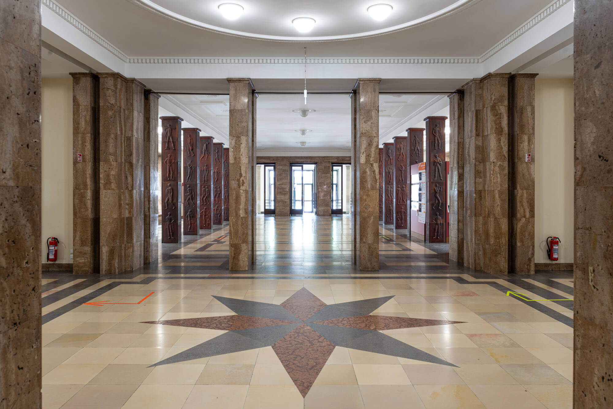 DescriptionIm Zentrum der kreuzförmigen Wandelhalle schmückt den Fußboden ein Opus sectile in Form eines Sterns, der aus Rosso Verona, einem roten Knollenkalk, und Crailsheimer Muschelkalk zusammengesetzt ist. Der Muschelkalk greift ein im Gebäude häufig auf Fußböden und an Treppen verwendetes Material auf, während der Rosso Verona ein Gestein ist, das eine hervorgehobene Wertigkeit besitzt und seltener Verwendung findet. Daraus bestehen auch die Türlaibungen im ersten Obergeschoss, und aus diesem Gestein sind die beiden Zierbrunnen von Fritz von Graevenitz gehauen (VBA-Sg-59), die in den Nischen der Wandelhalle stehen. Damit könnte ein Symbolkomplex gebildet sein: Stern, Brunnen und Tür – Symbole, die das Streben nach Erkenntnis an der Universität zum Ausdruck bringen konnten. Dafür sprechen die Inschriften, die auf den Rändern der Schalen der beiden Brunnen eingraviert sind:HOL AUS DEN QUELLEN DES WISSENS DIE KRAFT ZU EDELEN GEISTESFLUG, und: ERKENNE DAS WISSEN IST TRUG VOR DER STERNE EWIGEM LICHT.