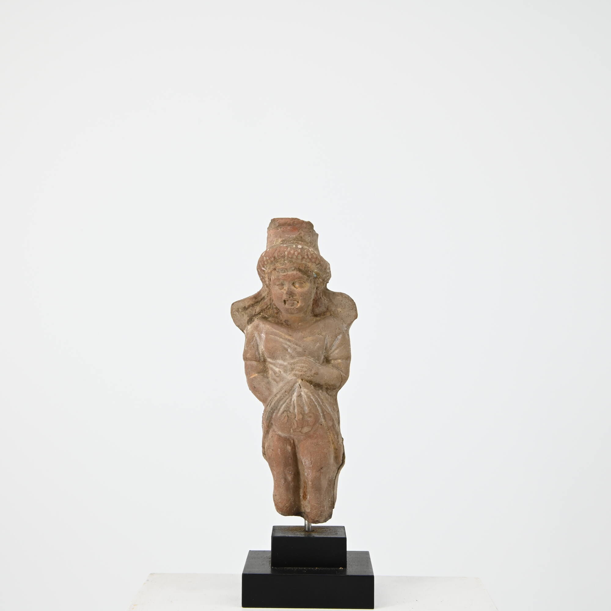 DescriptionFigürliches Parfümfläschen. Ein streng frontal ausgerichteter Knabe steht mit parallelen Beinen, mit der linken Hand hebt er den kurzärmligen Chiton vorne hoch, so daß sich eine Art Tasche ergibt, die prall gefüllt zu sein scheint. Mit der rechten Hand greift das Kind in den kugeligen Stoffbeutel hinein, der gewöhnlich mit Früchten gefüllt ist. Der Chiton ist aus einem auffällig dicken und sperrigen Stoff, der von nur wenigen schmal eingeschnittenen Falten zerknittert wird. Das runde Gesicht des Knaben wird von langen Haaren umrahmt, ein gepunkteter Kranz und eine Gefäßmündung in Form eines Kalathos bekrönen den Kopf. Breite Bindenenden flattern seitlich wie Flügel auf die Schultern.DimensionsH 12,4 cm; B 5,4 cm; T 3,8 cm