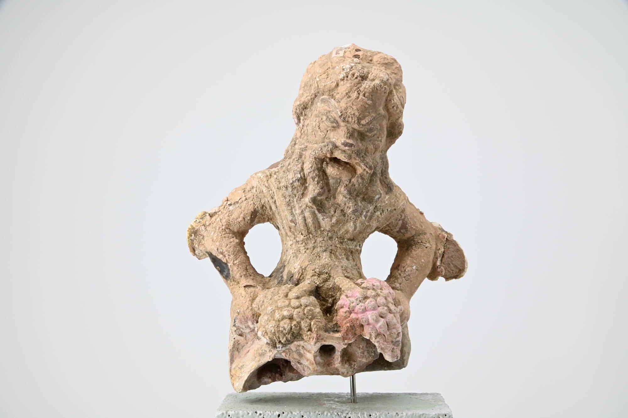 DescriptionVerhältnismäßig große, rundplastische Statuette eines Priapos: Mit beiden Händen rafft er seinen ärmellosen Chiton über sein Geschlecht hoch, um darin zwei große Trauben, die über den Uberschlag hinaushängen, aufzubewahren. Das unter der Brust gegürtete Gewand ist in breite, parallele Falten gelegt. Die ursprünglich eingesetzten Beine waren weit gespreizt. Der relativ große Kopf ist leicht zur rechten Seite gewandt, ein zotteliger Bart fällt in jeweils drei Strähnen auf die Brust. Der Mund ist erregt geöffnet, die wulstigen Brauenbögen sind stark nach oben gezogen. Zu einer teigigen Masse vereintes wirres Lockenhaar umgibt den Schädel.DimensionsH 17,7 B 15,5 T 6,1