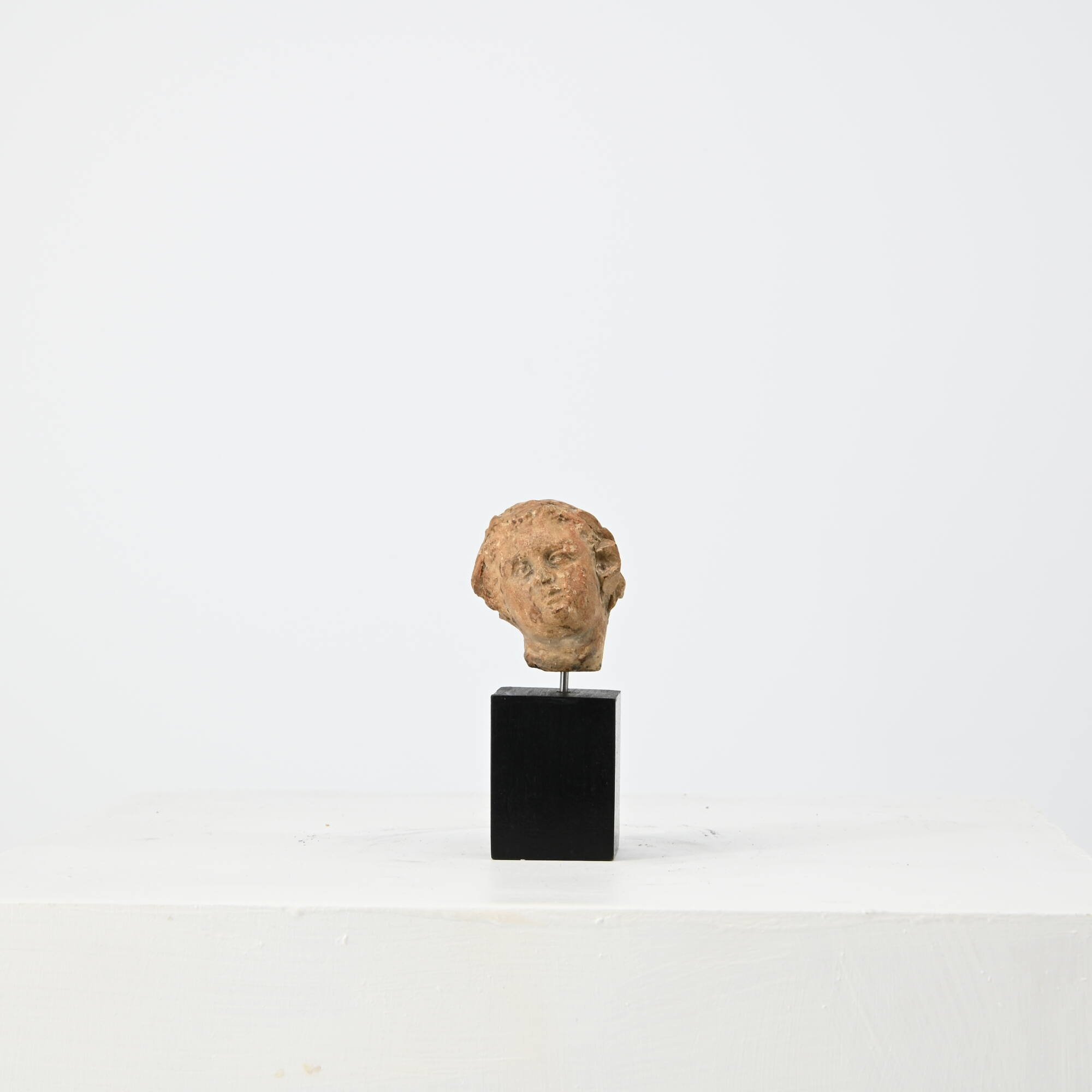 DescriptionStark zur rechten Seite bewegtes gedrungenes Köpfchen eines jungen Mannes mit pathetisch emporgerichtetem Blick. Die Augen liegen tief unter der der hohen glatten Stirn das Kinn steht etwas vor. Auf den undeutlich modellierten, struppig emporstehenden Haaren sitzt ein schmaler Kranz mit Blüten. Eventuell Dionysos.DimensionsH 3,4 cm