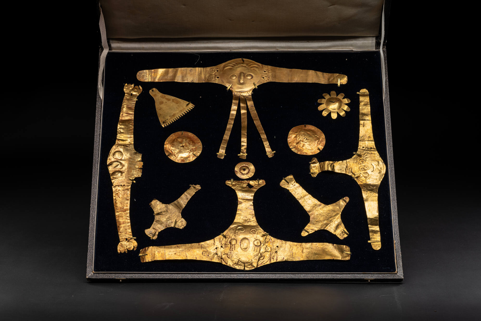 DescriptionDiese Goldschmuckgarnitur für Mumien besteht aus elf Teilen. Ähnlicher Mumienschmuck der Kultur der Paracas, die einst im südlichen Teil von Peru ansässig waren, wird heute etwa im Museo Chileno de Arte Precolombino in Santiago de Chile gezeigt.DimensionsH x B x T (Schatulle): 38,5 x 42 x 2,5 cm