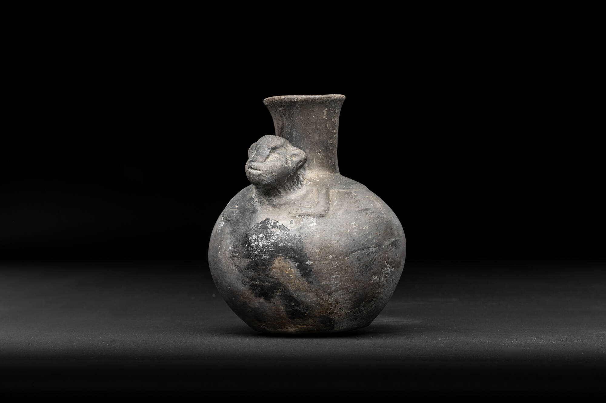 DescriptionDas Grau-schwarze Keramikgefäß (blackware) wird durch einen vollplastischen Tierkopf geschmückt. Der Körper und die Gliedmaßen des Tieres treten als Flachrelief unterhalb des Vasenhalses nur schwach hervor. Beim Blick von oben sind sie jedoch deutlich erkennbar. Die Form des Köpfchens lässt an einen Affenkopf denken. Affendarstellung auf Terrakoten finden sich häufiger als Motiv in der Chimú-Kultur. Mit welchen ikonographischen Inhalten die Figur des Affen in der Chimú-Kultur verbunden war, ist ebenso unerforscht, wie die Funktion dieses Kruges.DimensionsHöhe: 17 cm
