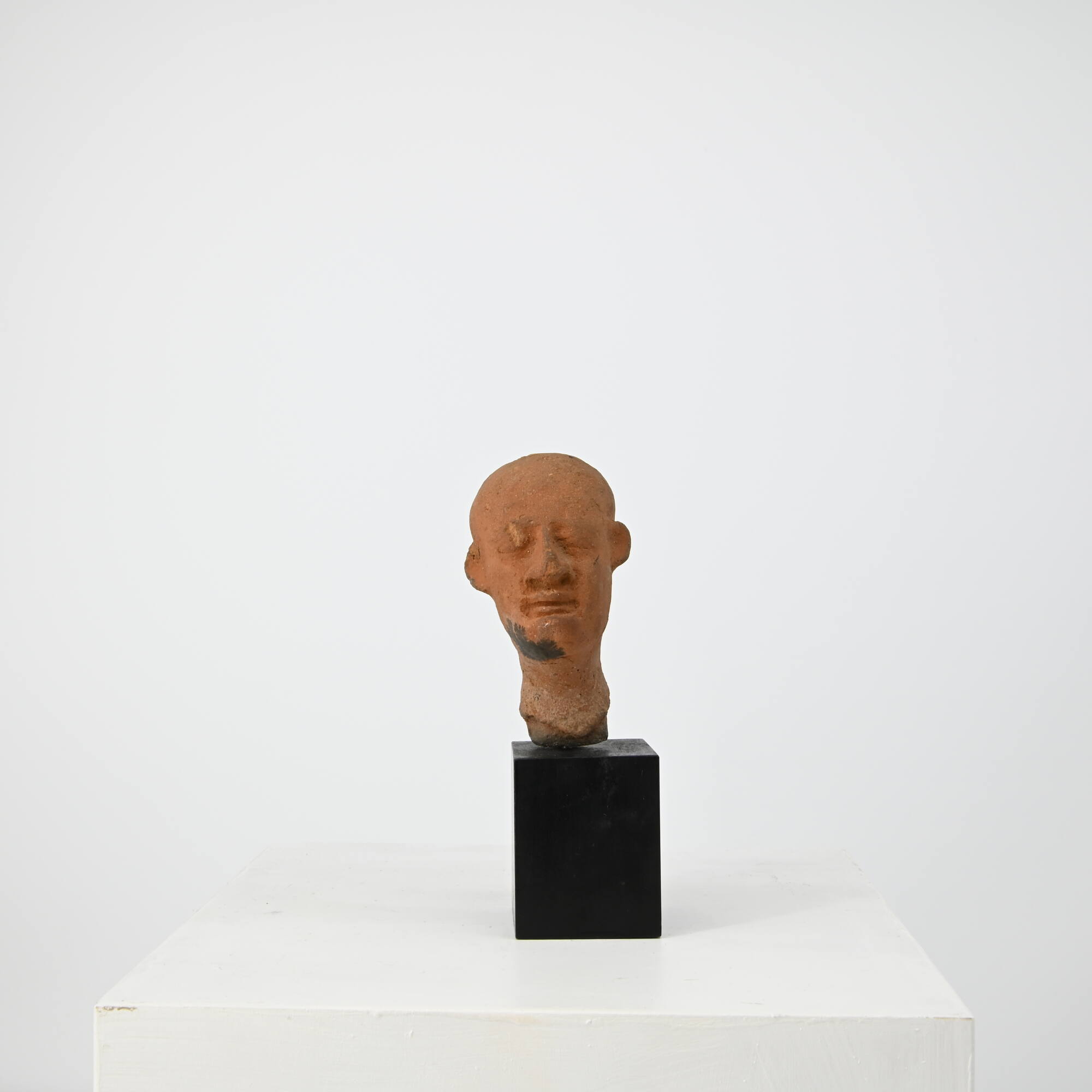 DescriptionGroßer kahler Kopf eines Ägypters mit hohem und ausladendem Schädel. Das länglich-eckige Gesicht ist schmal, die Augen quellen hervor. Die Nase ist lang und in den Flügeln breit, der breitgezogene Mund ist ungewöhnlich geradlinig.