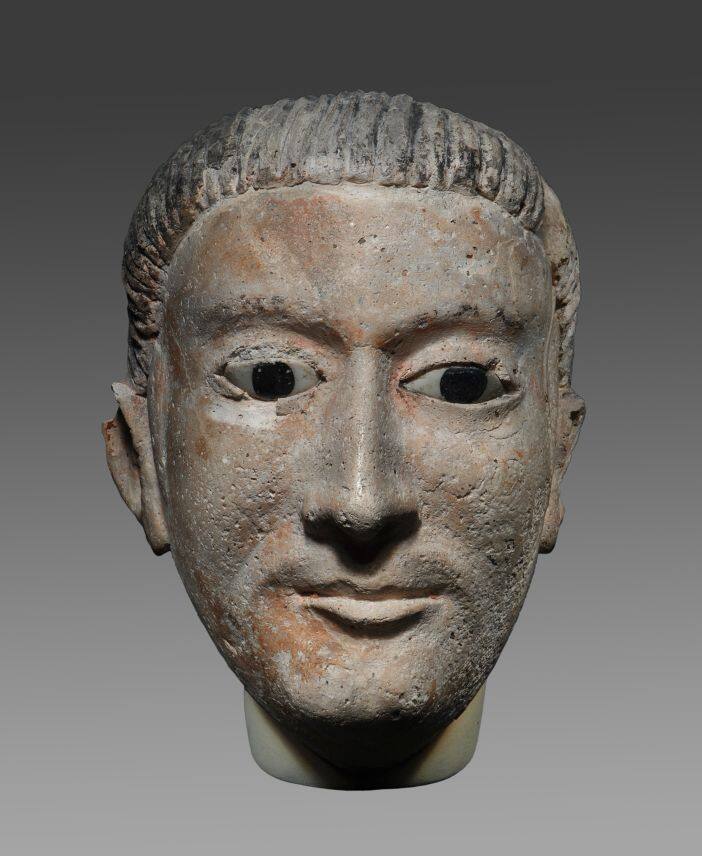 DescriptionDie aus dem römisch-kaiserzeitlichen Ägypten stammende Totenmaske besteht aus bemaltem Stuck, die expressiven Augen sind in farbiger Glaspaste eingesetzt. Die schlichte Topffrisur weist auf eine Entstehung in trajanischer Zeit.DimensionsH 21,5 cm, B 16,5 cm