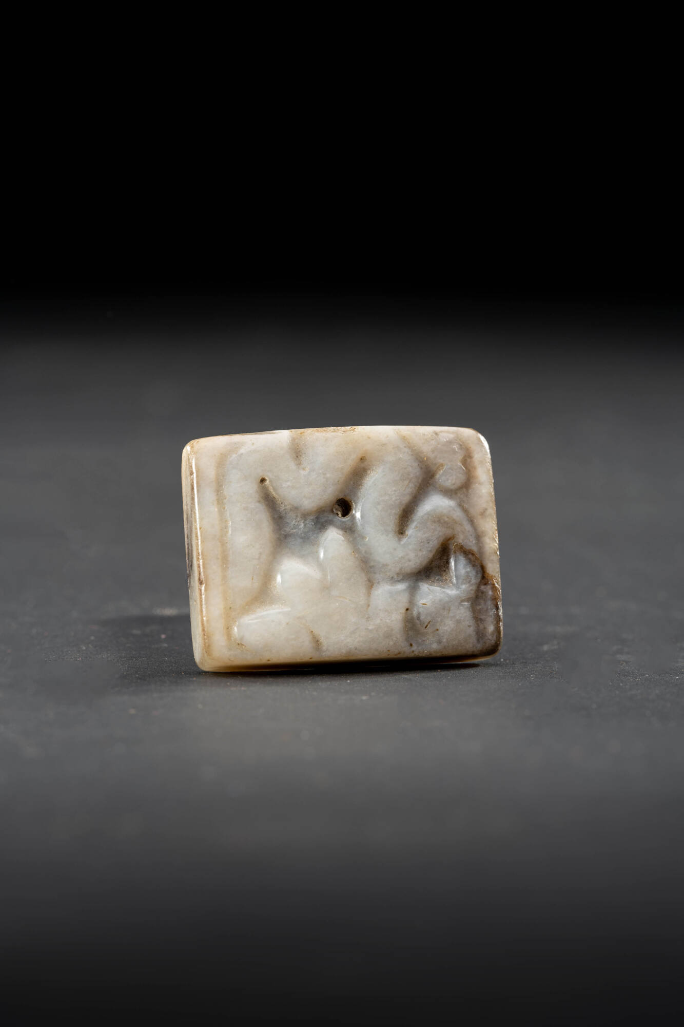 DescriptionDiese kleine Jadeit-Plakette ist ungewöhnlich, da der Stein eine sehr helle Farbe aufweist. Die Maya bevorzugten normalerweise Jadeit in sattem Grün oder Apfelgrün. Auch das Motiv des Reliefornaments ist außergewöhnlich: Es zeigt zwei nicht-figürliche Elemente, die in der Kunst der Maya oder anderer mesoamerikanischer Kulturen keine bekannten Entsprechungen haben. Das Fehlen von Angaben zur Herkunft des Objekts erschwert leider eine weitergehende Interpretation.DimensionsH x B x T: 4,3 x 3,2 x 0,9 cm