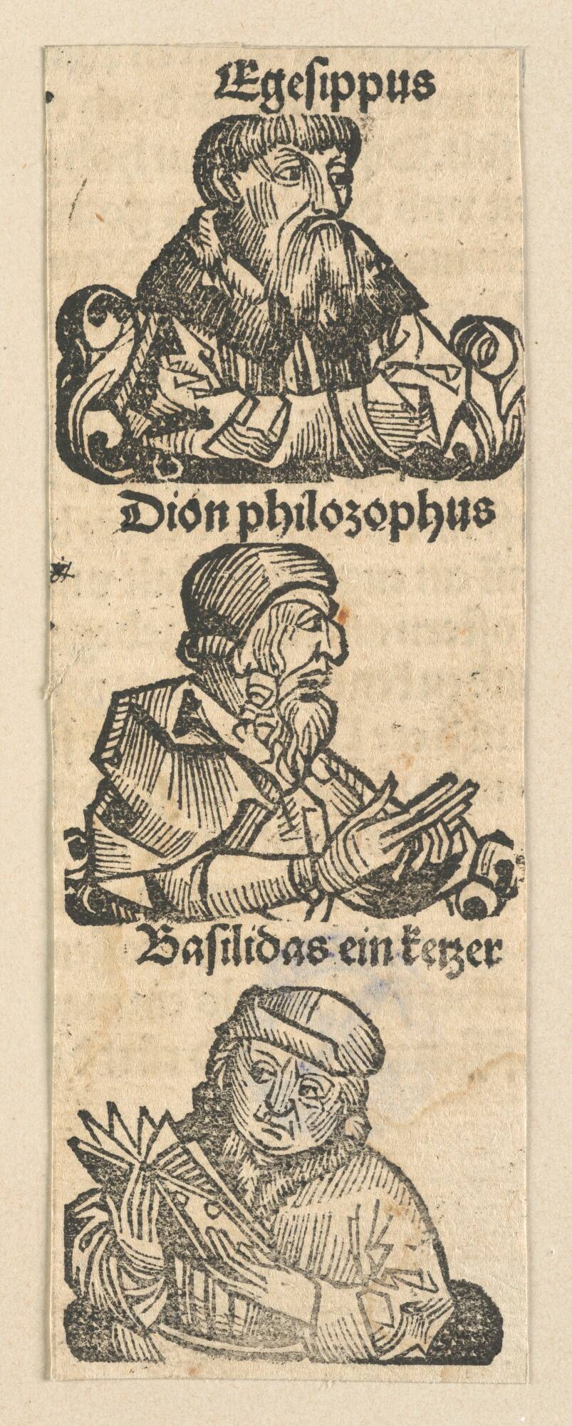 Schedelsche Weltchronik - Gelehrte: Egesiuppus, Dion philosophus, Basilidias ein kezer (111r)