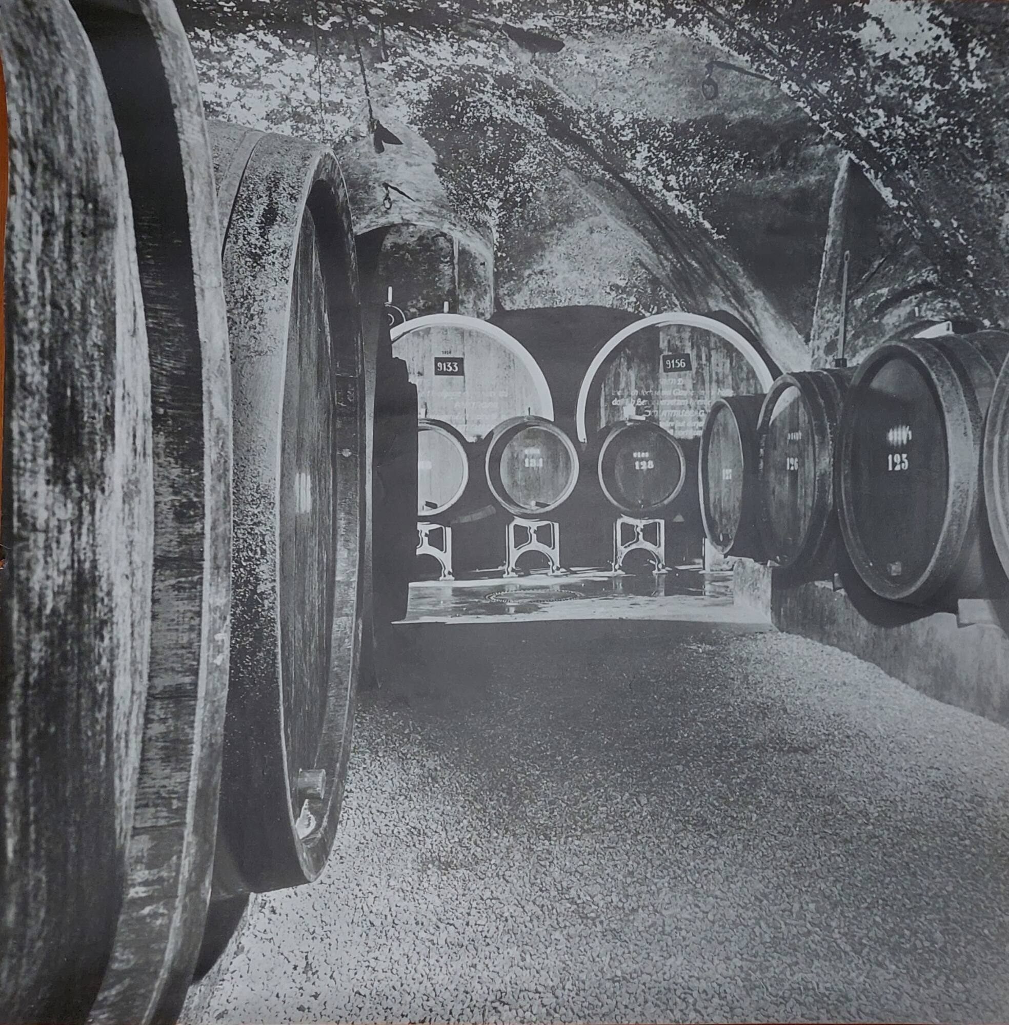 DescriptionDie schwarz-weiße Fotografie zeigt Fässer in einem Gewölbekeller. Dabei handelt es sich vermutlich um Weinfässer wobei dies nicht eindeutig zu erkennen ist. Die Fässer sind in eine schnorkeligen Schrift in weiß beschriftet. Dies ist jedoch zu unscharf um die Worte lesen zu können. MediumPapier