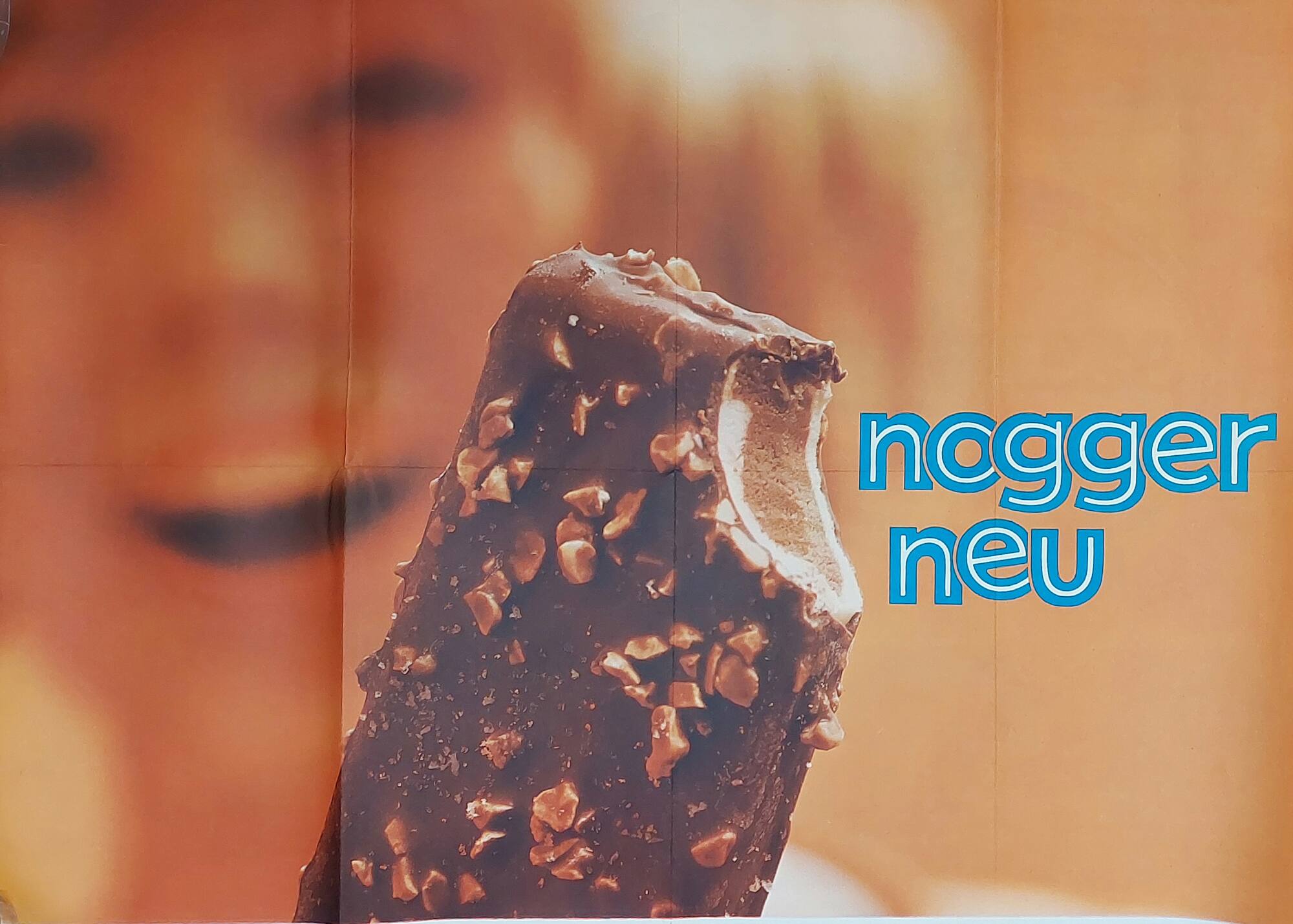 DescriptionWerbeplakat der Eiskrem Nogger von Langnese mit der Beschriftung ´Nogger neu´. Auf dem zweiteiligen Plakat wird die Eissorte, welche 1964 eingeführt wurde, abgebildet.DimensionsB x H (Oberteil): 118 x 85 cm
