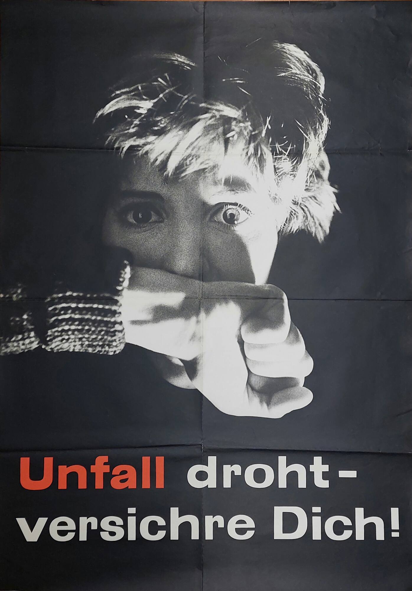 DescriptionSchwarz-weißes Werbeplakat mit dem Slogan "Unfall droht-Versichere dich!". Der Slogan ist zurückzuführen auf das Versicherungsunternehmen Allianz um die Zeit 1955 bis vermutlich 1957.