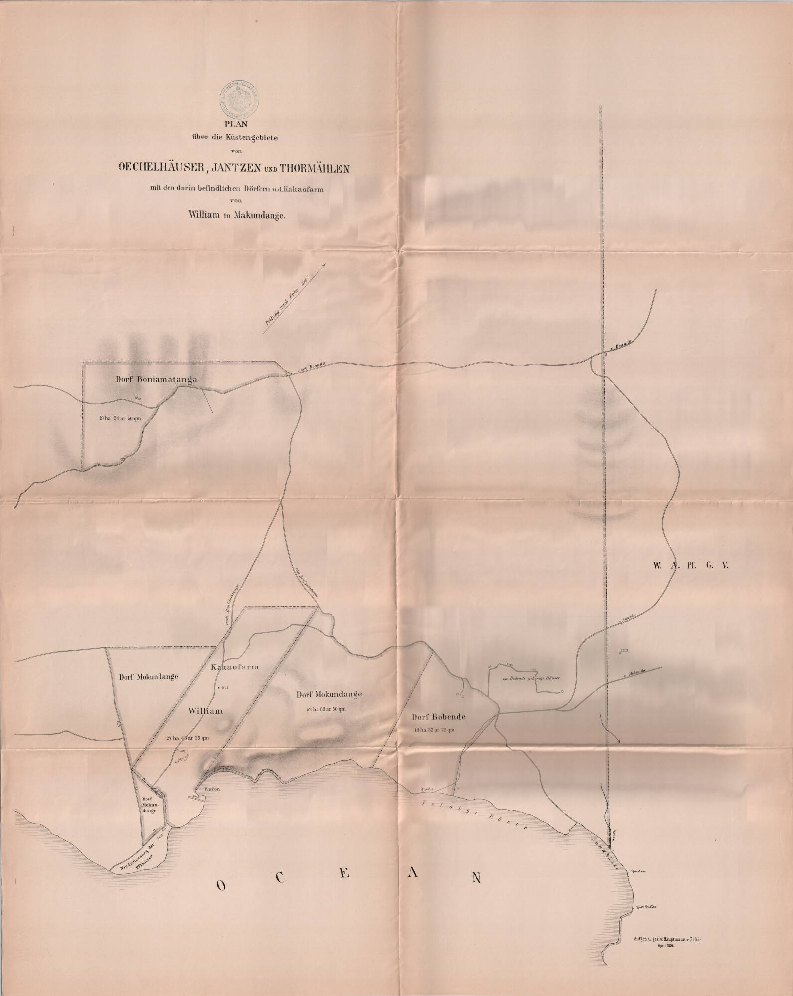 Plan über die Küstengebiete von Oechelhäuser, Jantzen und Thormählen mit den darin befindlichen Dörfern u. d. Kakaofarm von William in Makundange