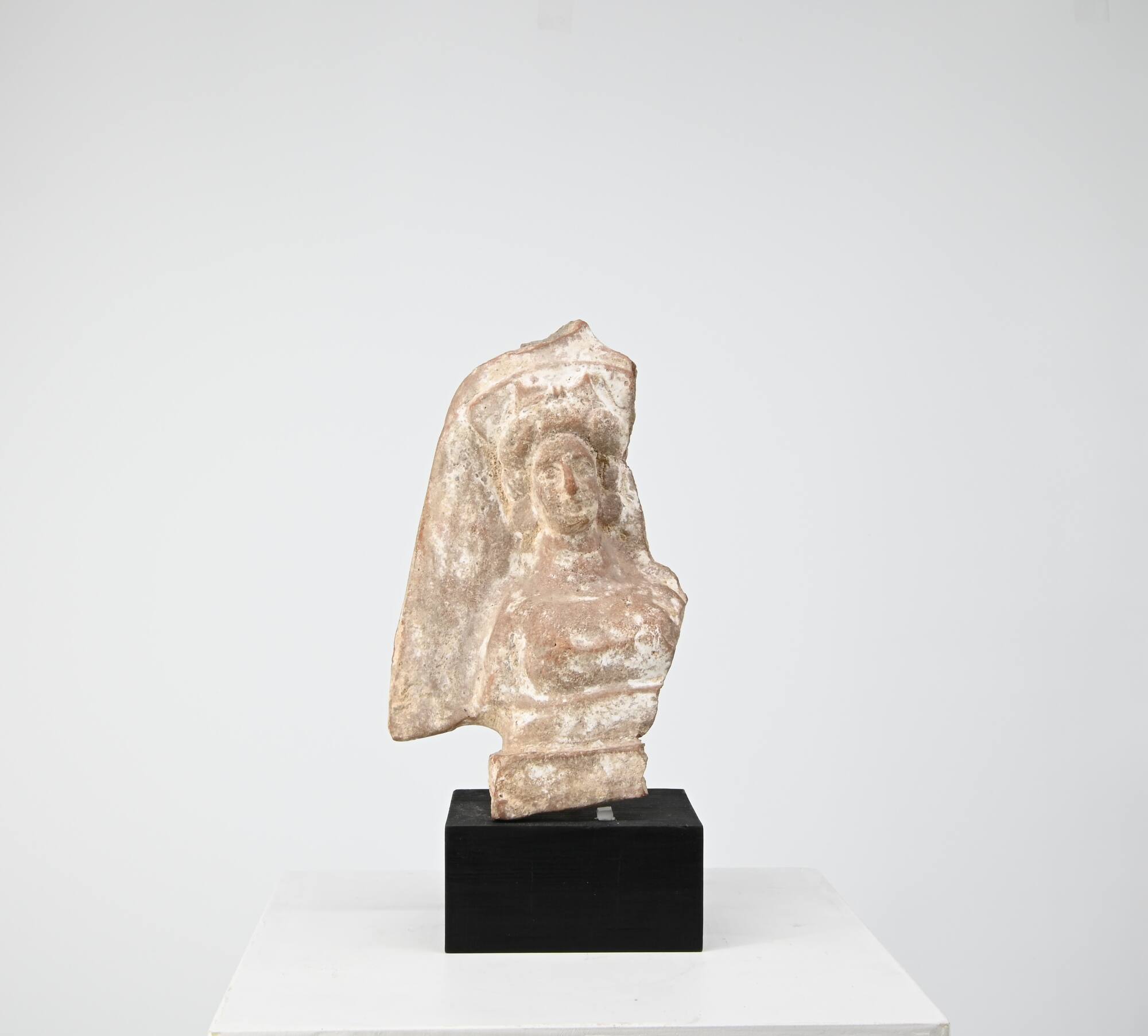 DescriptionWeibliche Büste mit Armstümpfen auf glatter stufenförmiger Basis, die von einem seitlich weit abstehenden, den Kopf bedeckenden Schleier gerahmt ist. Der Oberkörper mit wenig akzentuierten Brüsten ist anscheinend unbekleidet, der Hals lang. Auf dem langgestreckt-ovalen Kopf liegt ein massiver runder Kranz, von dem runde Glieder oberhalb der Ohren herabhängen. Spitzzackige emporstehende Blätter überschneiden einen breit ausgedehnten, unverzierten Kalathos, der vom Schleier bedeckt wird. Darüber war ein weiteres, jetzt abgebrochenes Kopfattribut.Demeter-/Kybelebüste? Als Lichthäuschen verwandt.