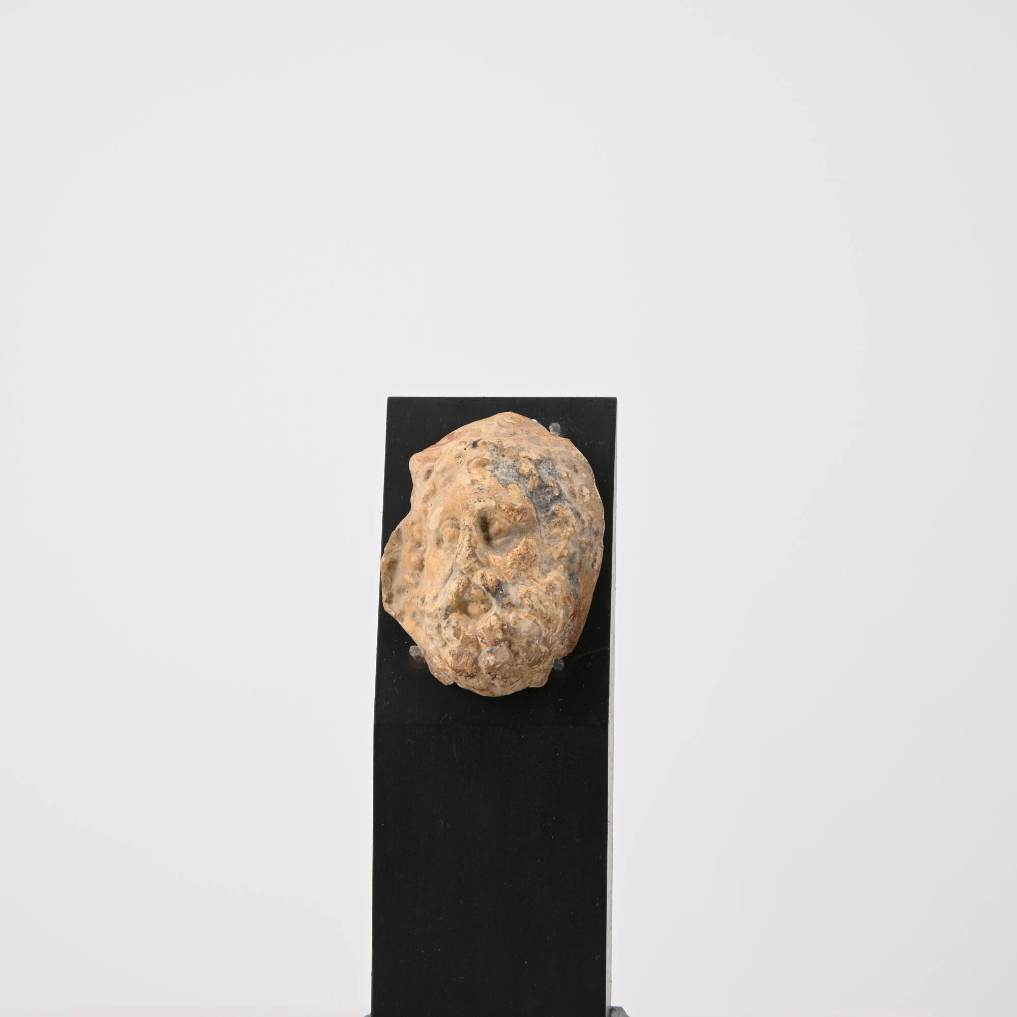DescriptionKleiner Kopf mit Buckellockenbart, der in der Mitte gescheitelt ist und unruhig modellierten, langen lockigen Haaren, die die Stirn als hochspringende Zangen umrahmen. Auf dem Scheitel liegt ein lanzetförmiges Schmuckstück, an der rechten Schläfe steht ein Blatt spitz vor. Die engstehenden Augen sind ungewöhnlich groß, die Augäpfel hervorquellend. Vermutlich Herakles.DimensionsH 5,3 cm, B 3,8 cm