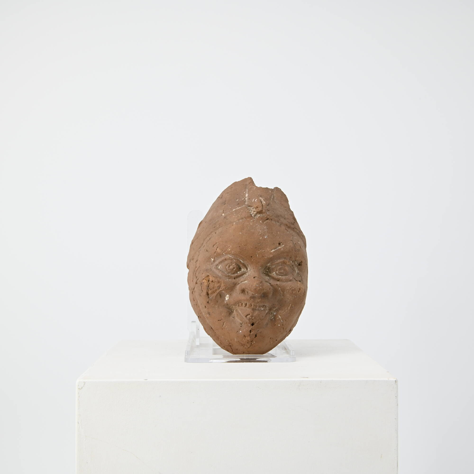 DescriptionSehr tiefe, stark gebogene Maske, die an kleinen Löchern an der Schläfe aufgehängt war. Sie stellt ein männliches oder weibliches Gesicht dar, das die Zunge bleckt. Am Oberkiefer ist eine eingeritzte Zahnreihe sichtbar. Die großen weitgeöffneten Augen werden von schnurartigen Lidern umrandet, die Pupillen sind mit zwei Kreisen eingeritzt. Das Gesicht wird von einer Ritzlinie umgeben, die eventuell eine Kopfbedeckung imitieren soll.DimensionsH 10,1 cm, T 6,7 cm
