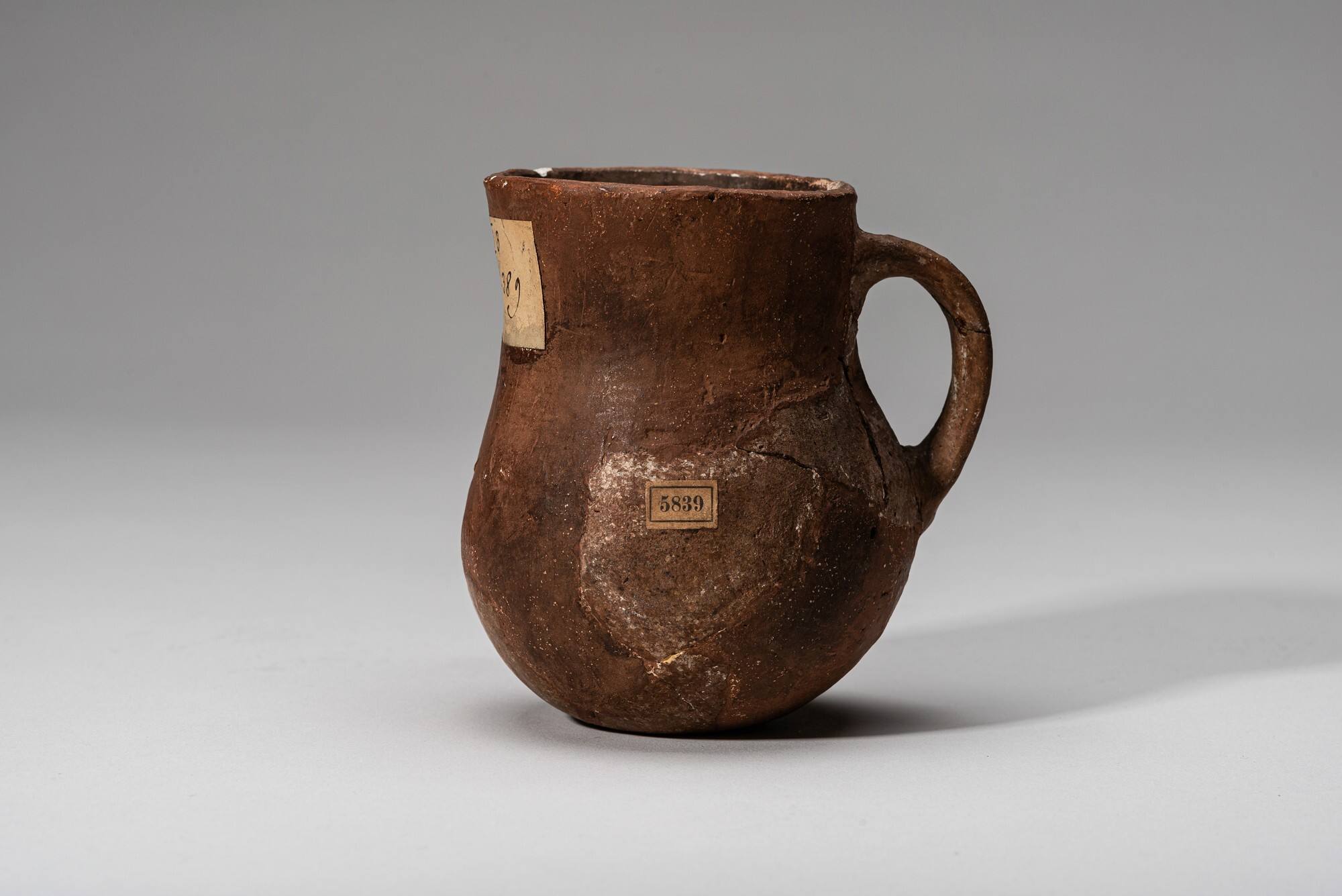 DescriptionEin kugelförmiges Kännchen mit leicht nach hinten abgeschrägtem Rand und einem leicht unterrandständigem, bandförmigem Vertikalhenkel.Object numberKLA-Or-730